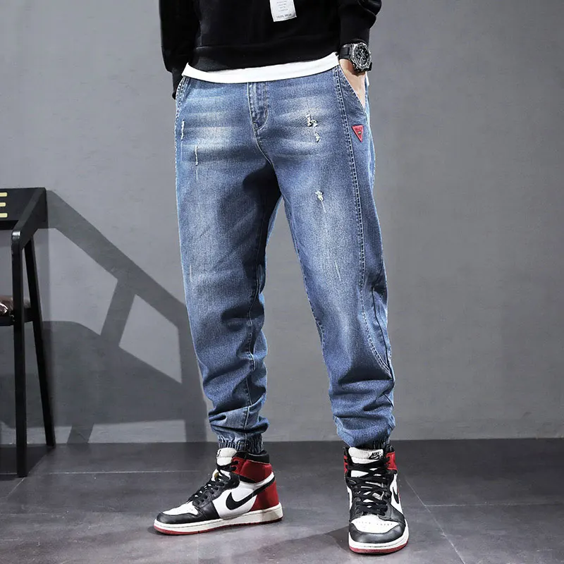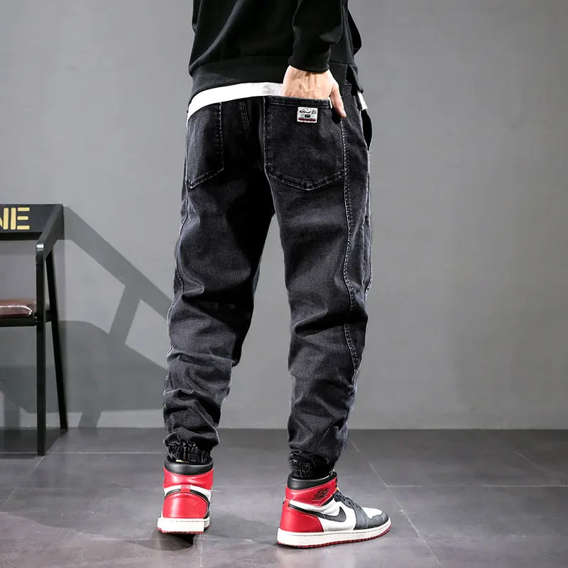 Japanese Fashion Men Jeans Loose Fit Casual Spliced Denim Cargo Pants Harem Trousers Elastic Waist Hip Hop Jeans Men Joggers