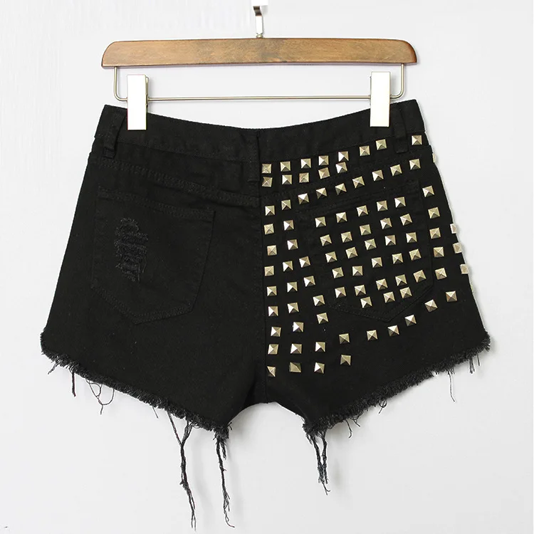 .Images of Europe and The United States Explosion Models Hot Sale Hole Riveting Irregular Denim High Waist Pants Short