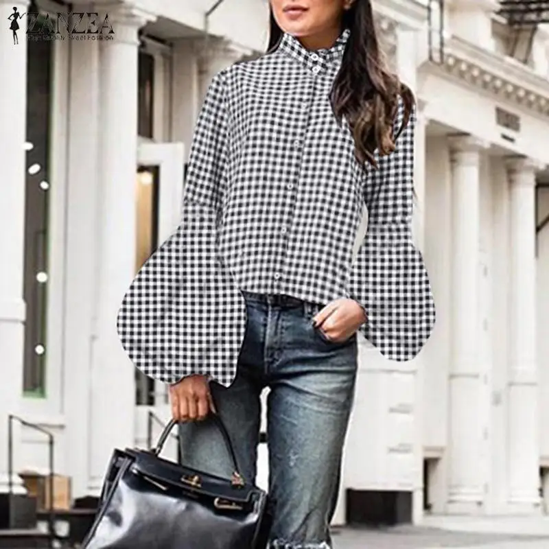 Best 2020 Spring Shirts ZANZEA Fashion Plaid Work Office Blouse Long Puff Sleeve Check Chemise Women Casual Tunic Tops Female Blusas Free Shipping
