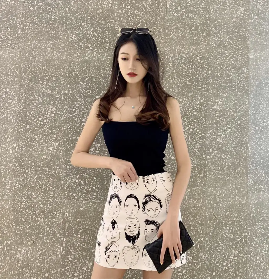 Good Chance of Comic Face Print Retro Skirt Comic Print High Waist A Line Skirt Women Fashion Bodycon Mini Skirts