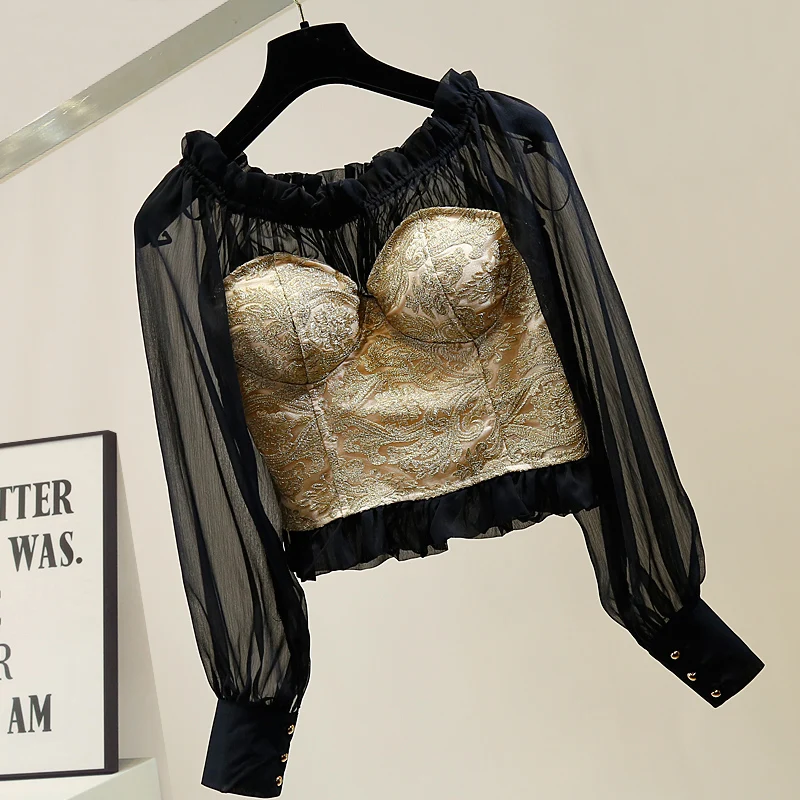 Addition Information of Embroidery Frilled Slash Neck Chiffon Shirt Women's Fashion Short Tops Crop Top Ladies Sexy Blouse Blusas Femininas De 2020