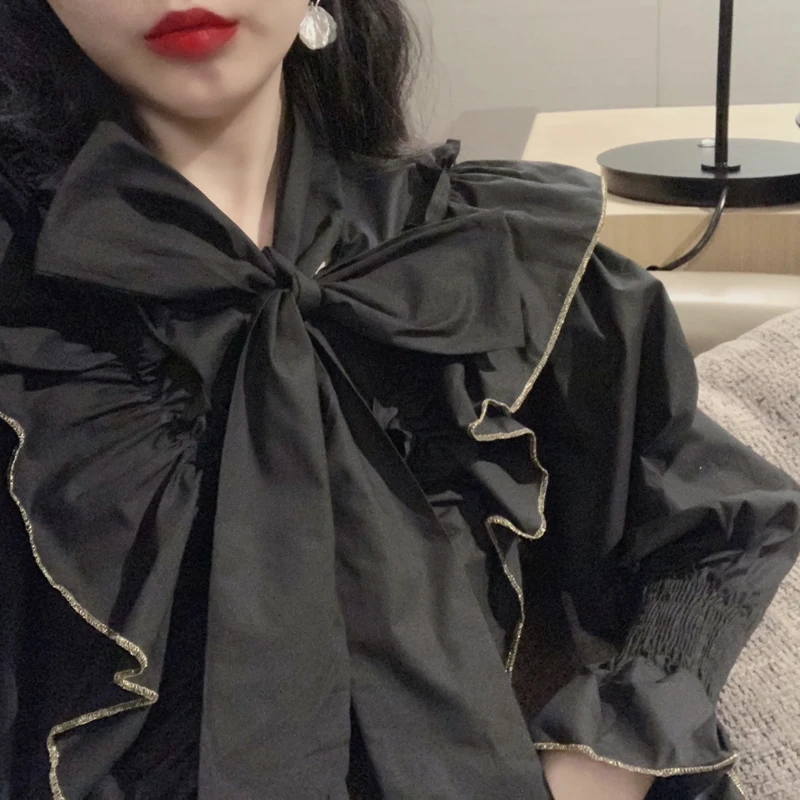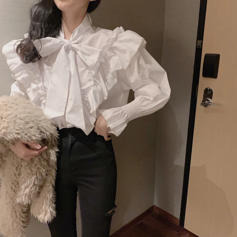 Addition Information of French Style 2020 Spring New Blouse Sweet Ribbon Bandage Bow Collar Design Shirt Blusas Cute Puff Sleeve Loose White Shirt