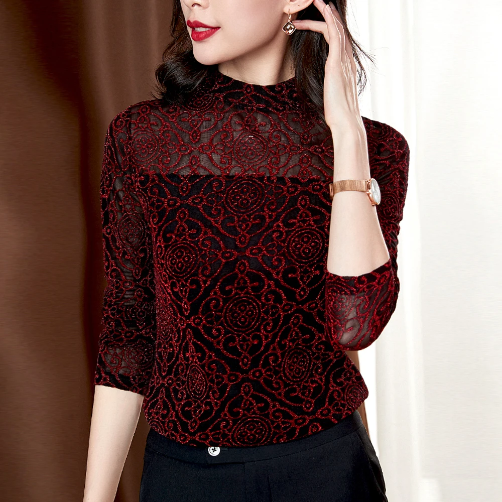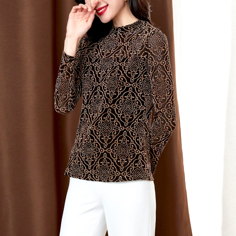 If You want to buy for Blouses , then Mesh Hollow Out Bottoming Shirts Women Long-sleeved O-Neck 2020 Spring Summer New Tops Bright Silk Bronzing Slim Stretch Shirt is possible make you like