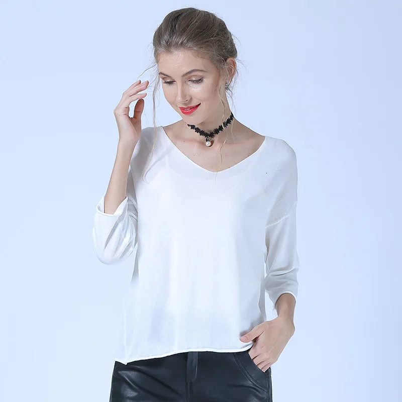 .Images of New Summer Simple V Neck Women Knitting Pullovers Ladies Casual Loose Jumpers Female Soft Tops Plain Color 2020 Roupa Feminina