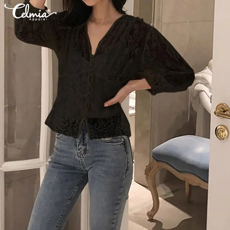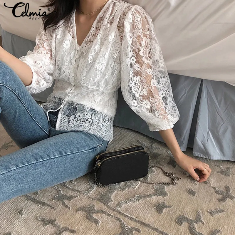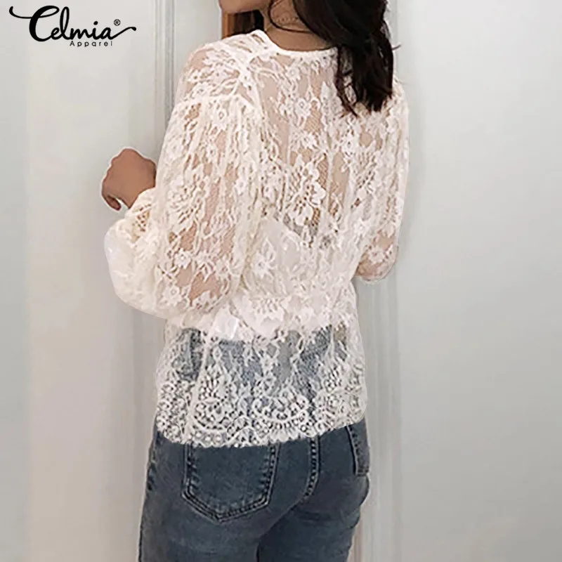 .Gallery of Womens Hollow Out Blouses Celmia Lace Lantern Sleeve Sexy V-Neck Casual Tops Shirts Elegant Office Blusas Plus Size S-5XL Femme