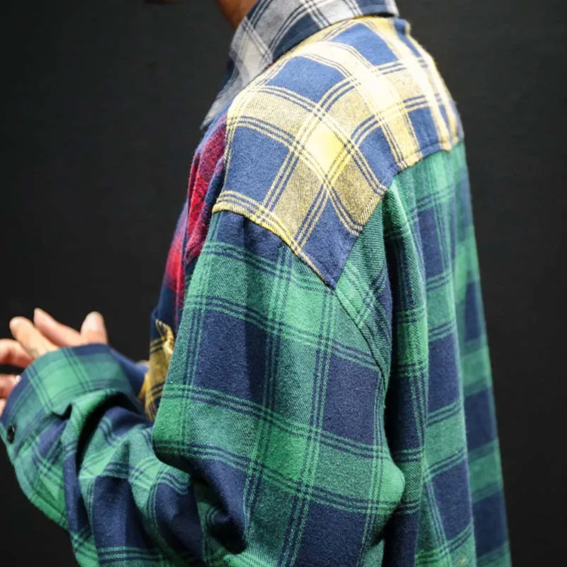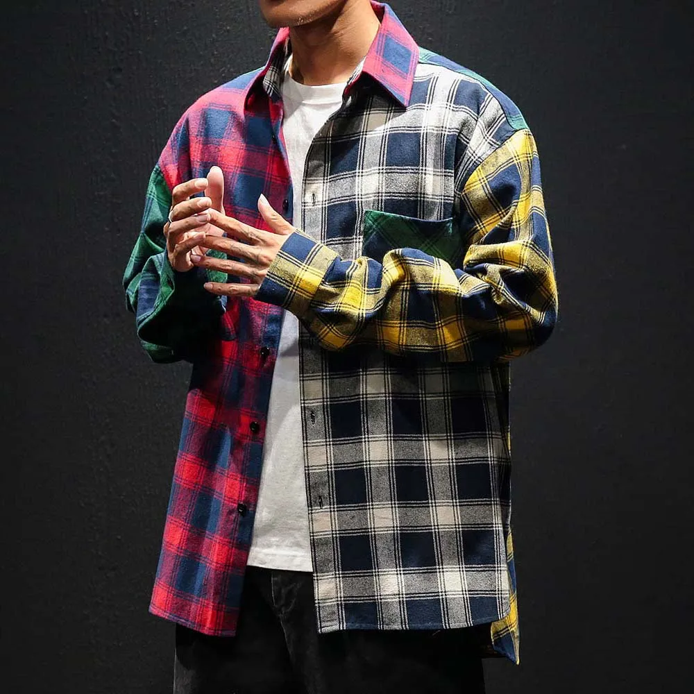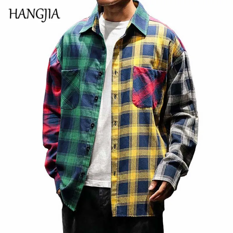 .Pictures for 2019 Vintage Plaid Colorblock Shirts Men's Fashion Long Sleeve Patchwork Tartan Shirt Men Hip Hop Casual Urban Clothing