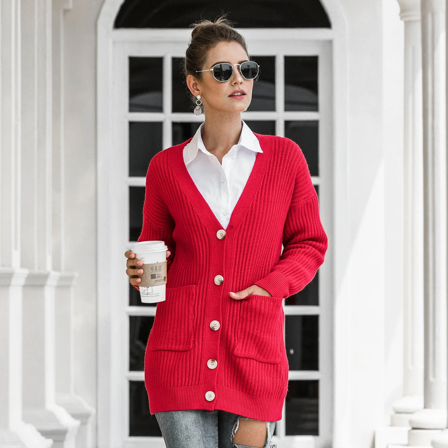 Cheap Autumn Winter Ladies Single-breasted Knitted Cardigan Mujer Women V Neck Simple Sweater Outwear Plain Color 2020 Jersey Mujer Free Shipping
