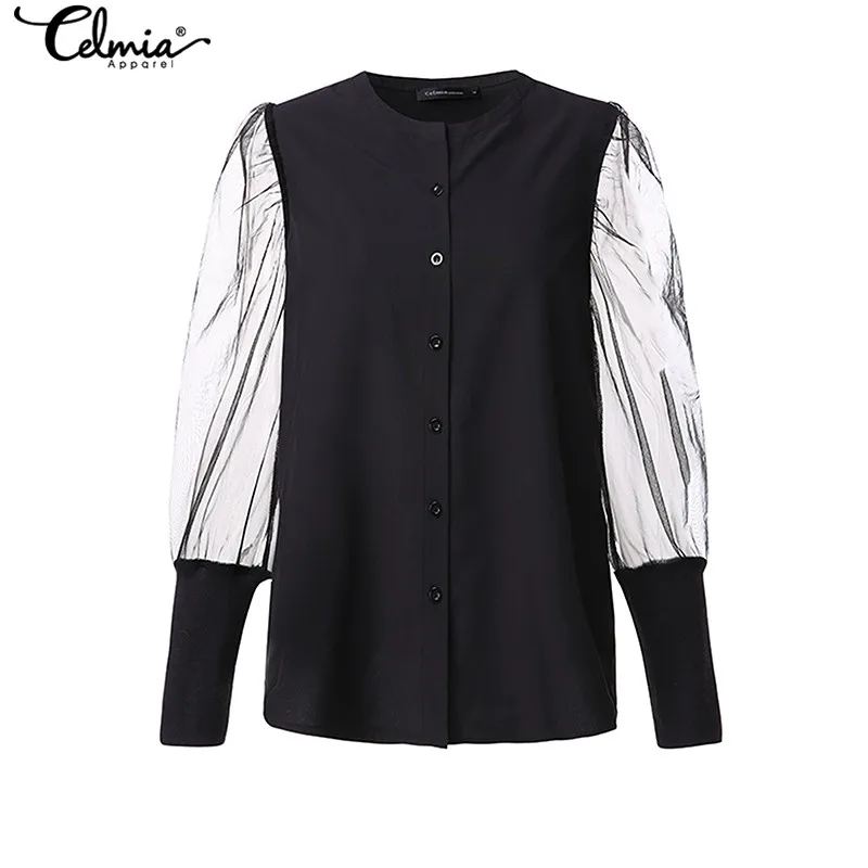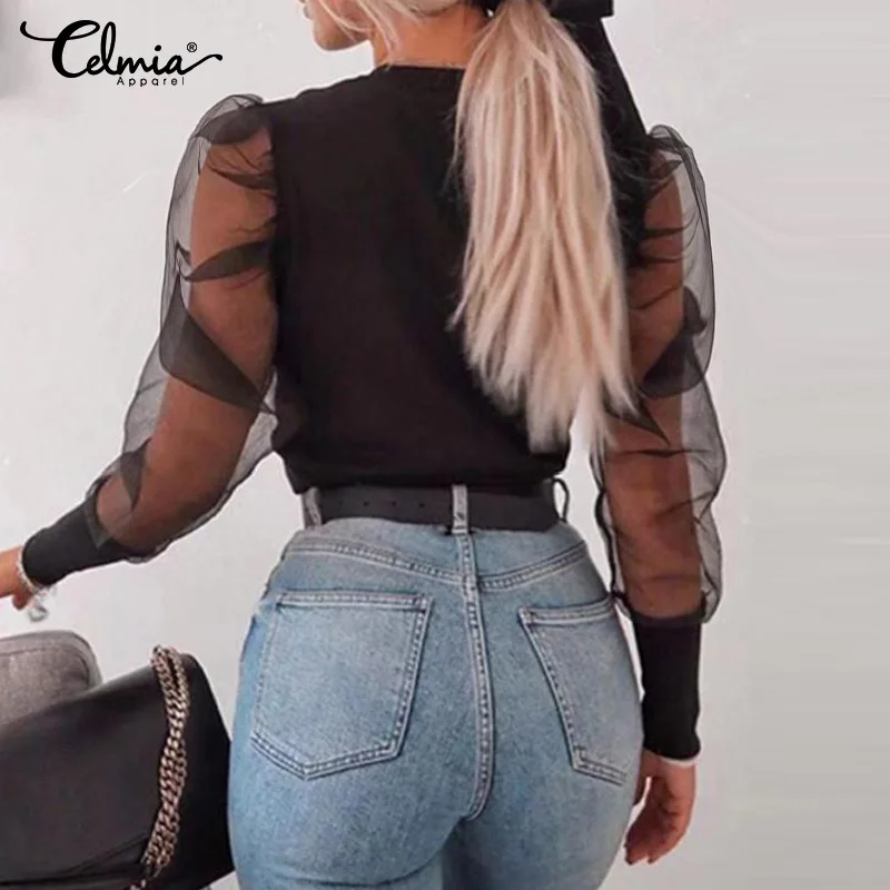 .Images of Celmia S-5XL Elegant Mesh Sheer Shirts Women Sexy See-through Tunic Tops Casual O Neck Long Sleeve Blouses Feamle Work Blusas 7