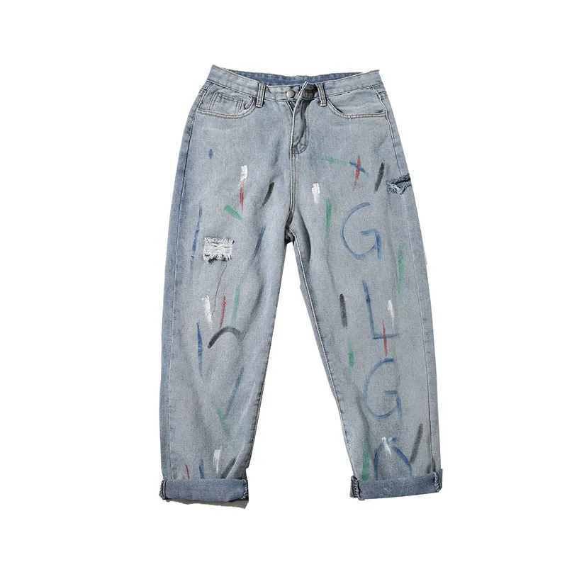 Addition Information of Hole Jeans Men's Fashion Graffiti Printed Casual Straight Jean Pants Men Streetwear Wild Loose Hip Hop Denim Trousers Mens S-3XL