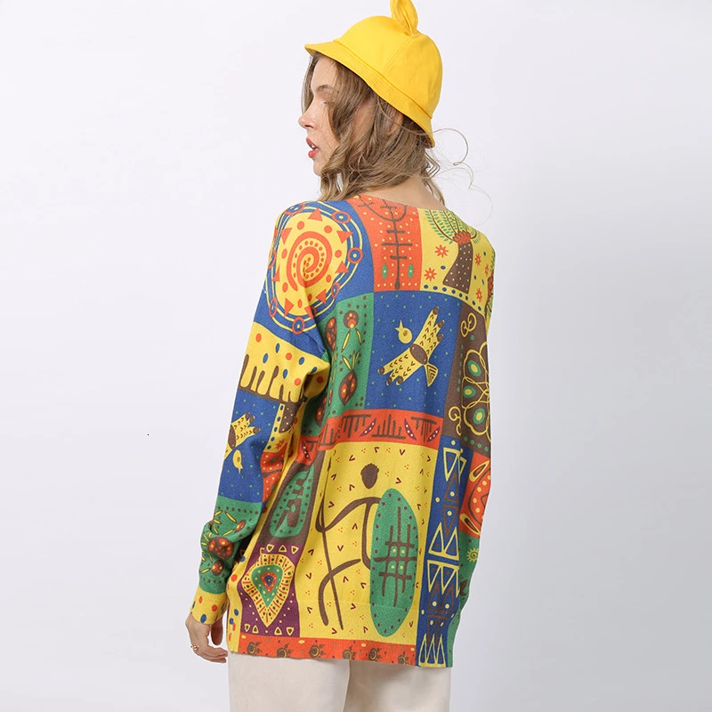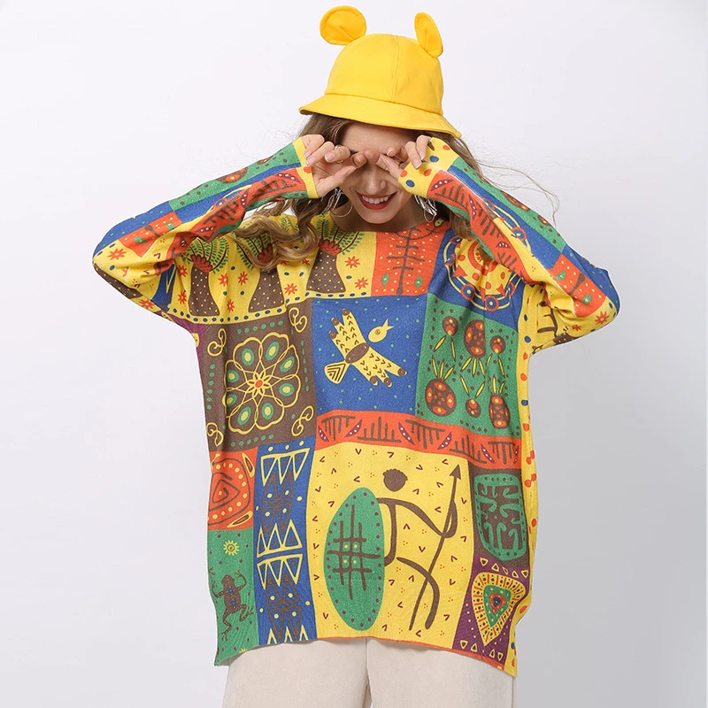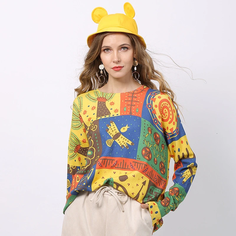 Price Description of Lovely Cartoon Printed Sweater Women Casual Loose Knitted Pullovers Autumn Winter Ladies O Neck Bat Sleeve Jumpers Pull Femme