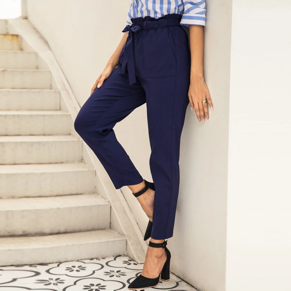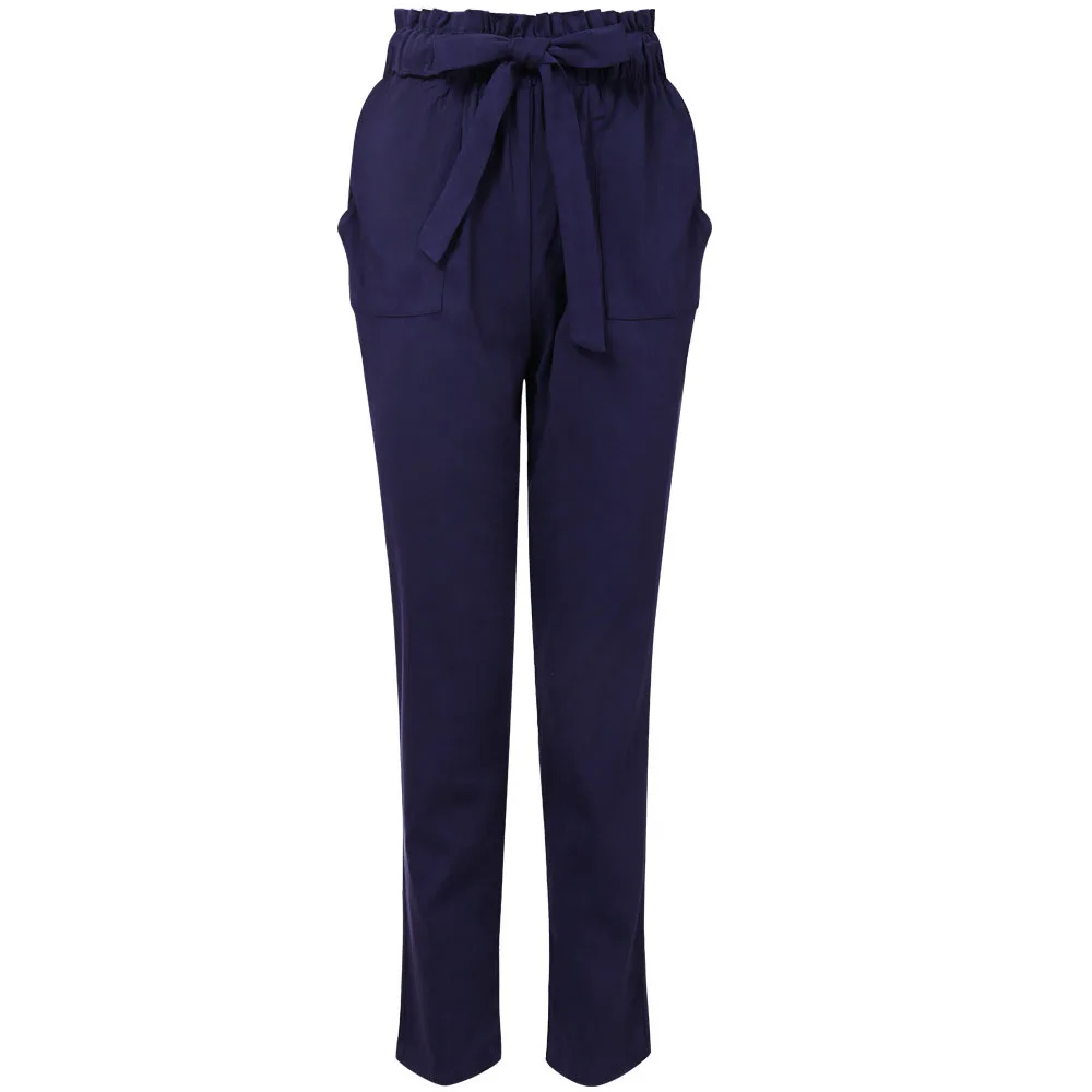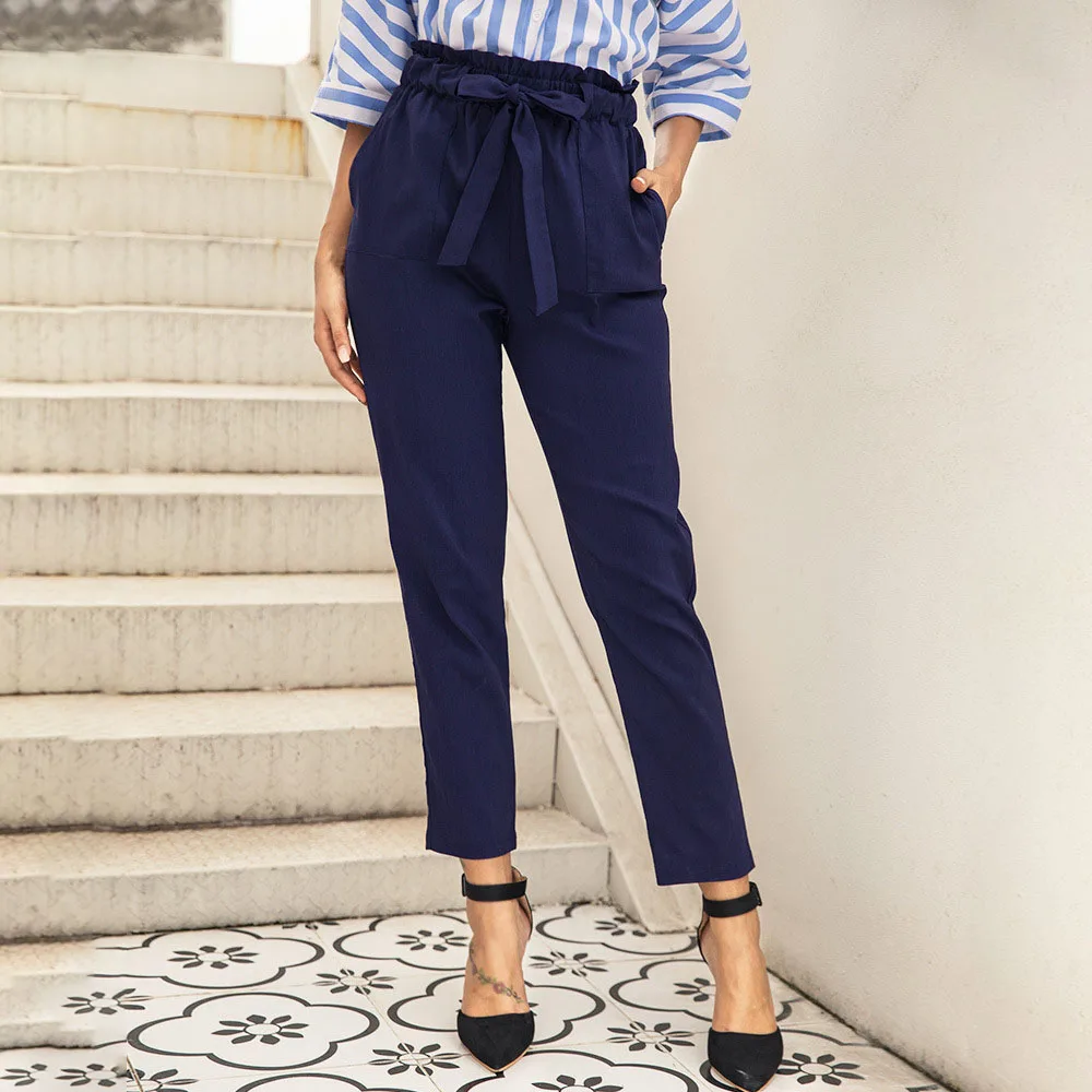 Best Chance for Office Ladies High Waist Pants Elegant Work Wear Skinny Trousers Women Solid Pocket Front Tie Blue Pencil Pants Casual Summer