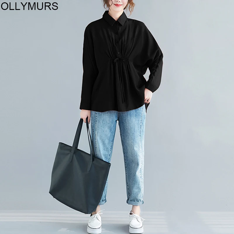 Streetwear Puff Sleeve White Office Women Shirts Blouses Long Sleeve Buttons Casual Blouse Mujer New Turn Down Collar Ruched Top