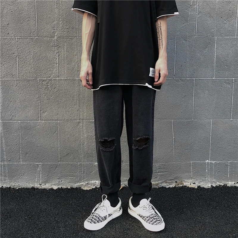 Cheap Ripped Straight Jeans Men's Fashion Washed Casual Hole Black Jeans Pants Men Streetwear Wild Loose Hip Hop Denim Trousers Mens Free Shipping