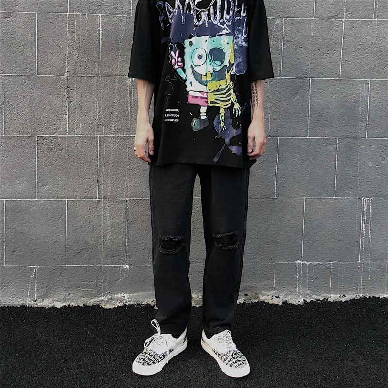 Good Price for Ripped Straight Jeans Men's Fashion Washed Casual Hole Black Jeans Pants Men Streetwear Wild Loose Hip Hop Denim Trousers Mens