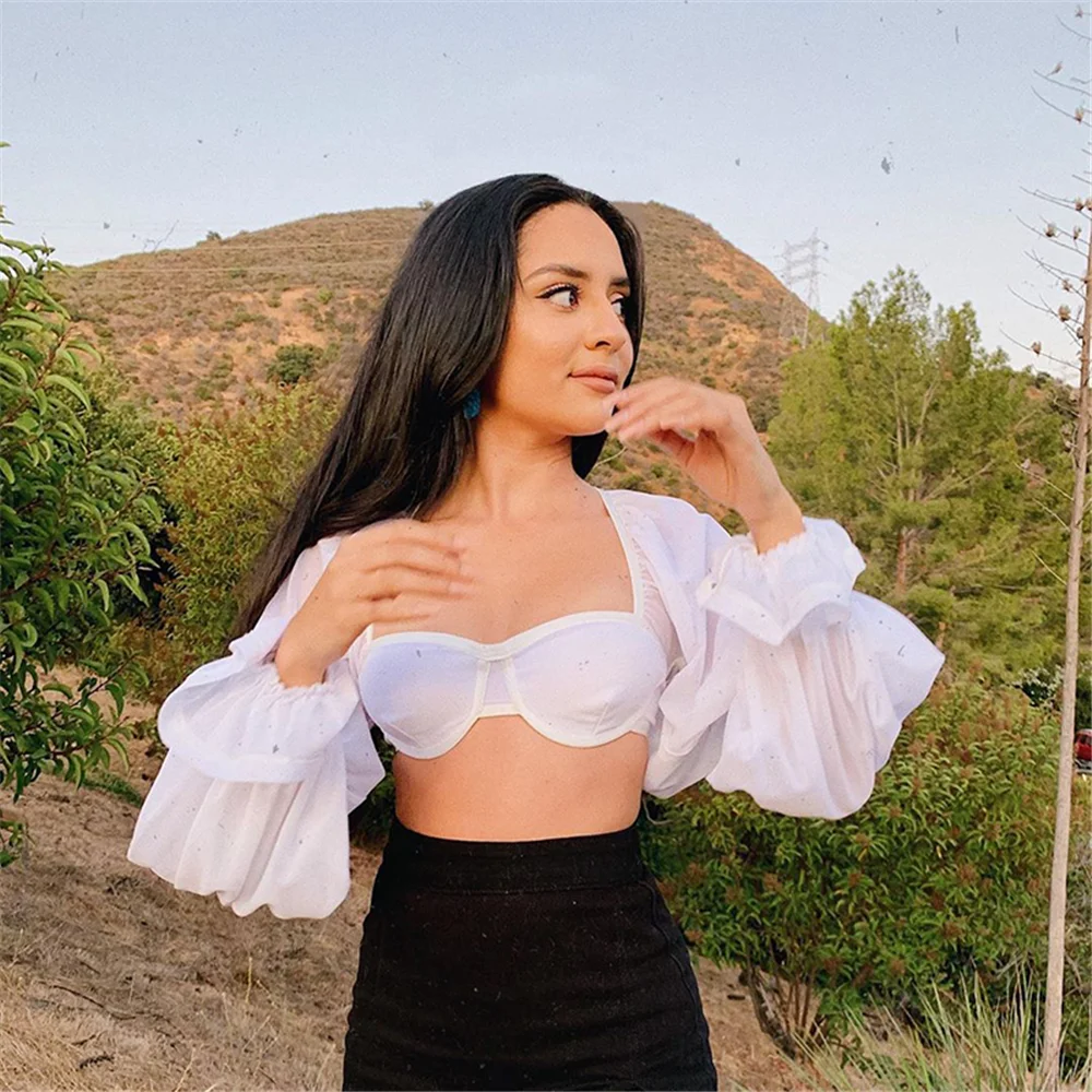 Limited Price for Three Ratels Tank Top Mesh Spliced Blouses Tops Long Lantern Sleeve Solid Cropped Shirt Ladies Natural Elegant Casual Streetwear
