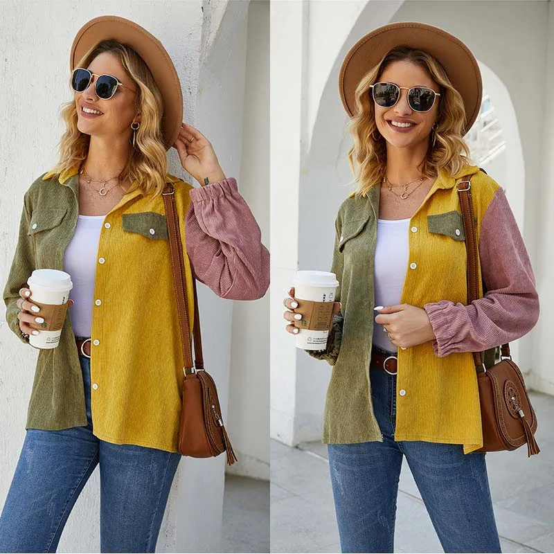 Chance Description for Casual Contrast Color Blouse Women Pocket Stand Collar Long Sleeve Corduroy Shirt Ladies Fashion Tops Clothes Blusa Feminina