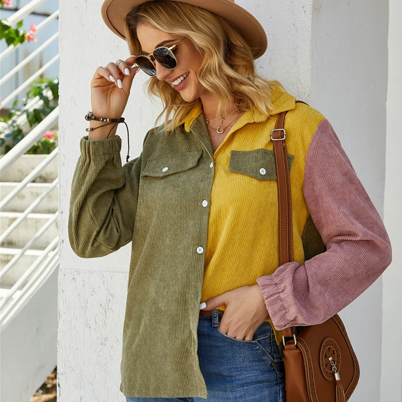 Best Casual Contrast Color Blouse Women Pocket Stand Collar Long Sleeve Corduroy Shirt Ladies Fashion Tops Clothes Blusa Feminina Free Shipping