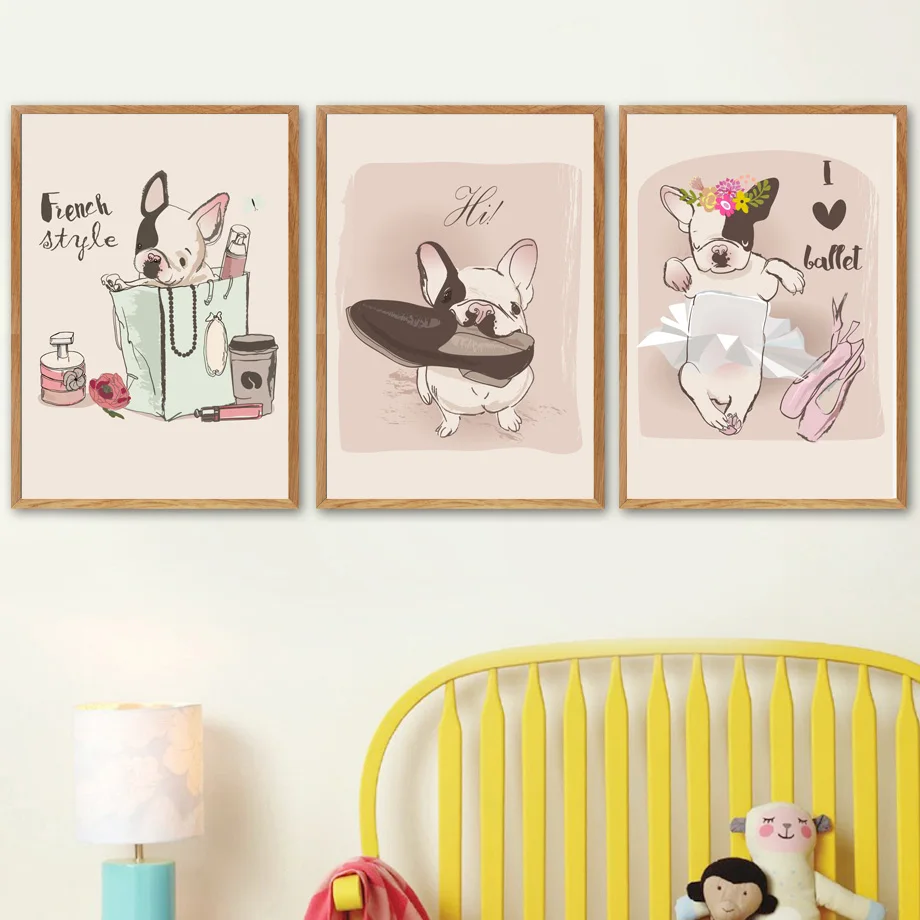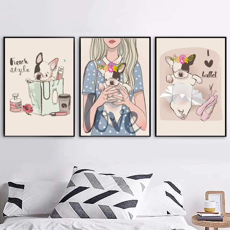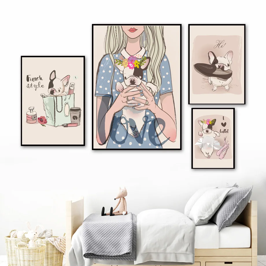 .Gallery of French Bulldog Love Girl Cosmetic Cartoon Flower Dog Wall Art Canvas Painting Wall Pictures Kids Baby Room Home Decor