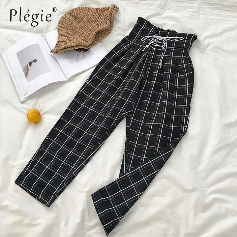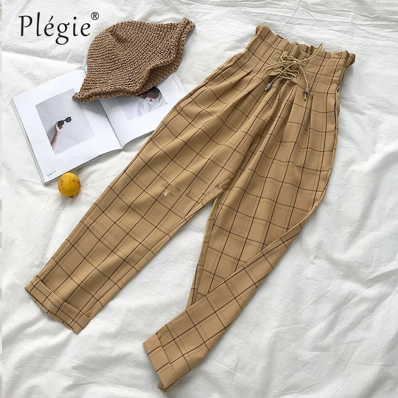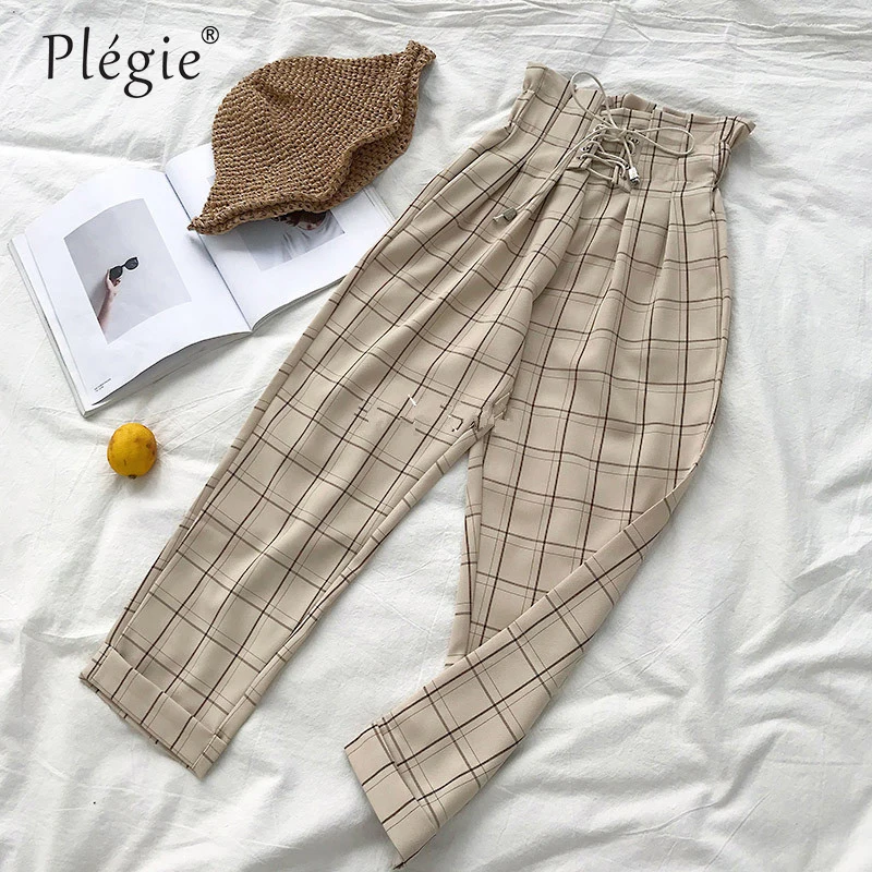 Special Chance for Plegie Drawstring Lacing Up Waist Plaid Pants Women 2019 New Spring Autumn Ankle Length Harem Pants Plaid Striped Pantalon Femme
