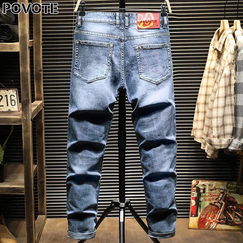 Limited Price for POVOTE jeans men's hip hop trend pants slim pencil pants men's jeans pants locomotive jeans pattern trend design OSK