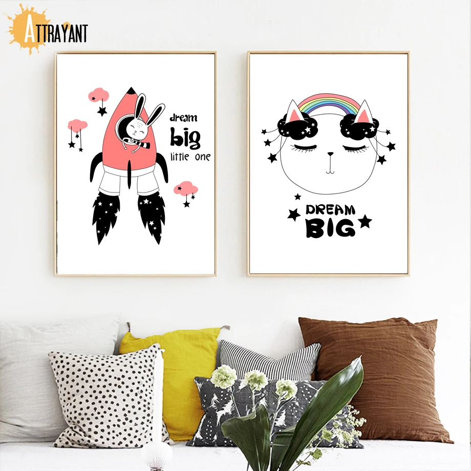 Best Rocket Rabbit Rainbow Cat Wall Art Canvas Painting Nordic Posters And Prints Wall Pictures For Kids Baby Boy Girl Room Decor Free Shipping
