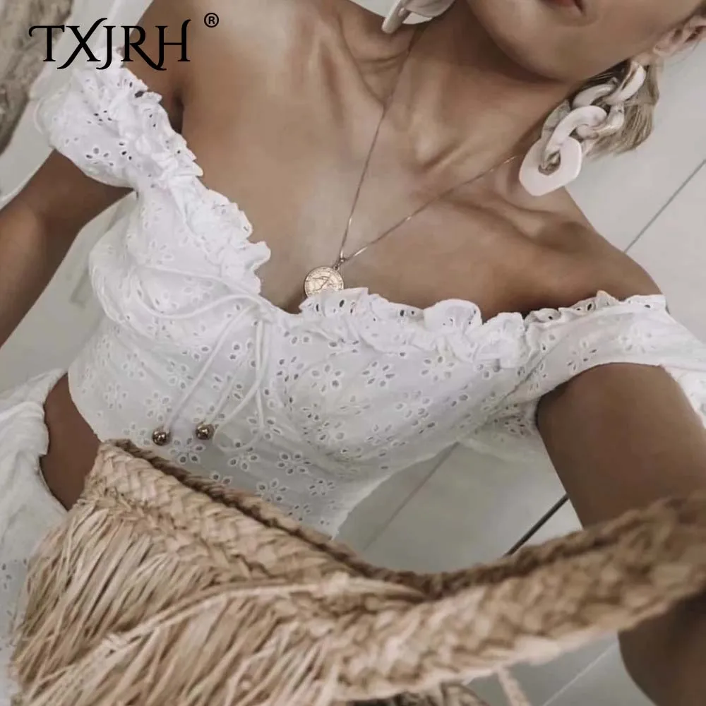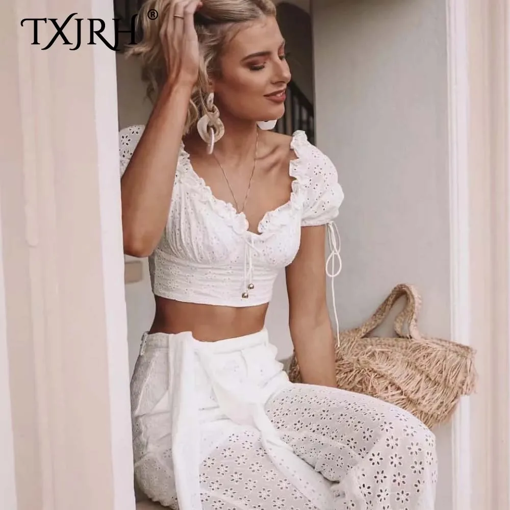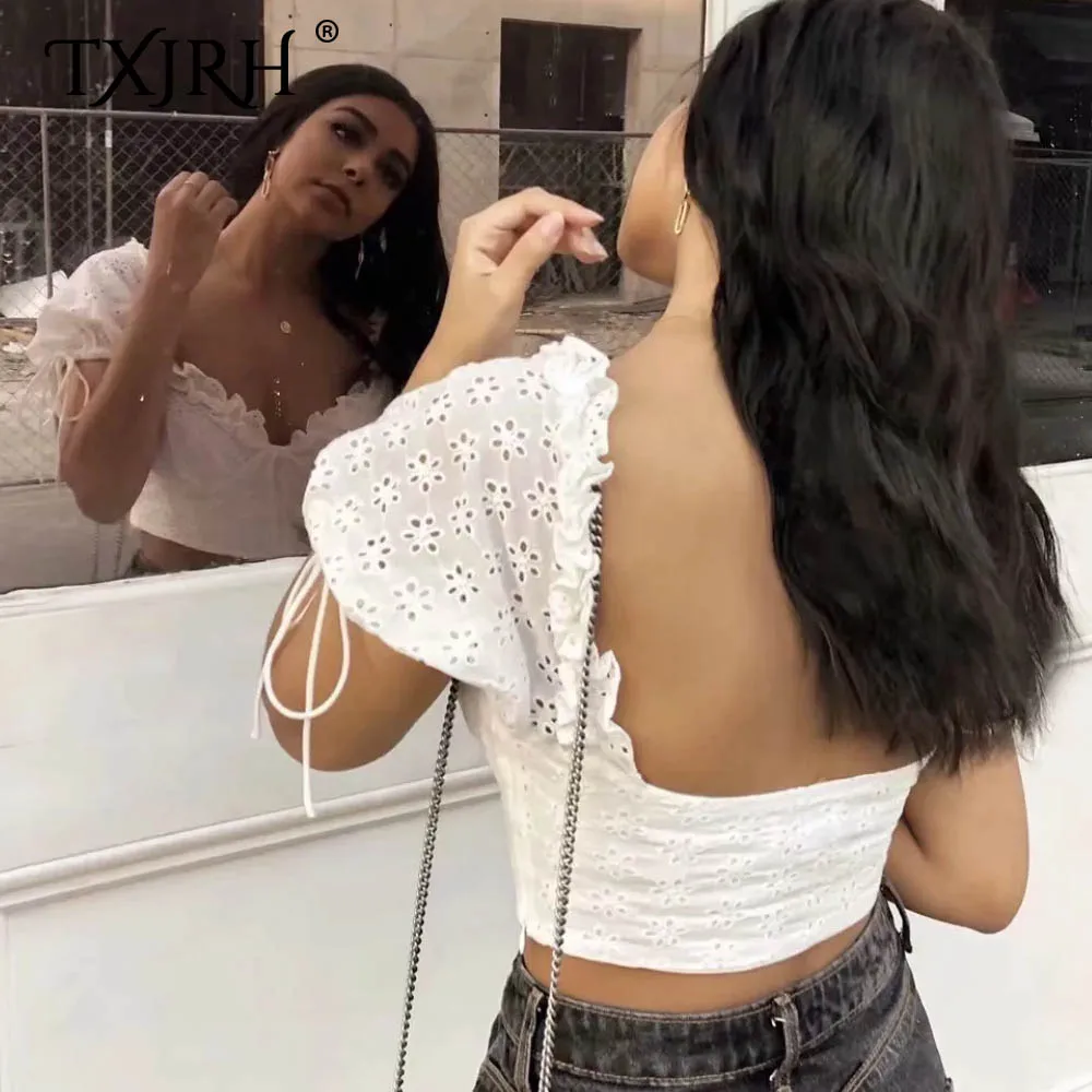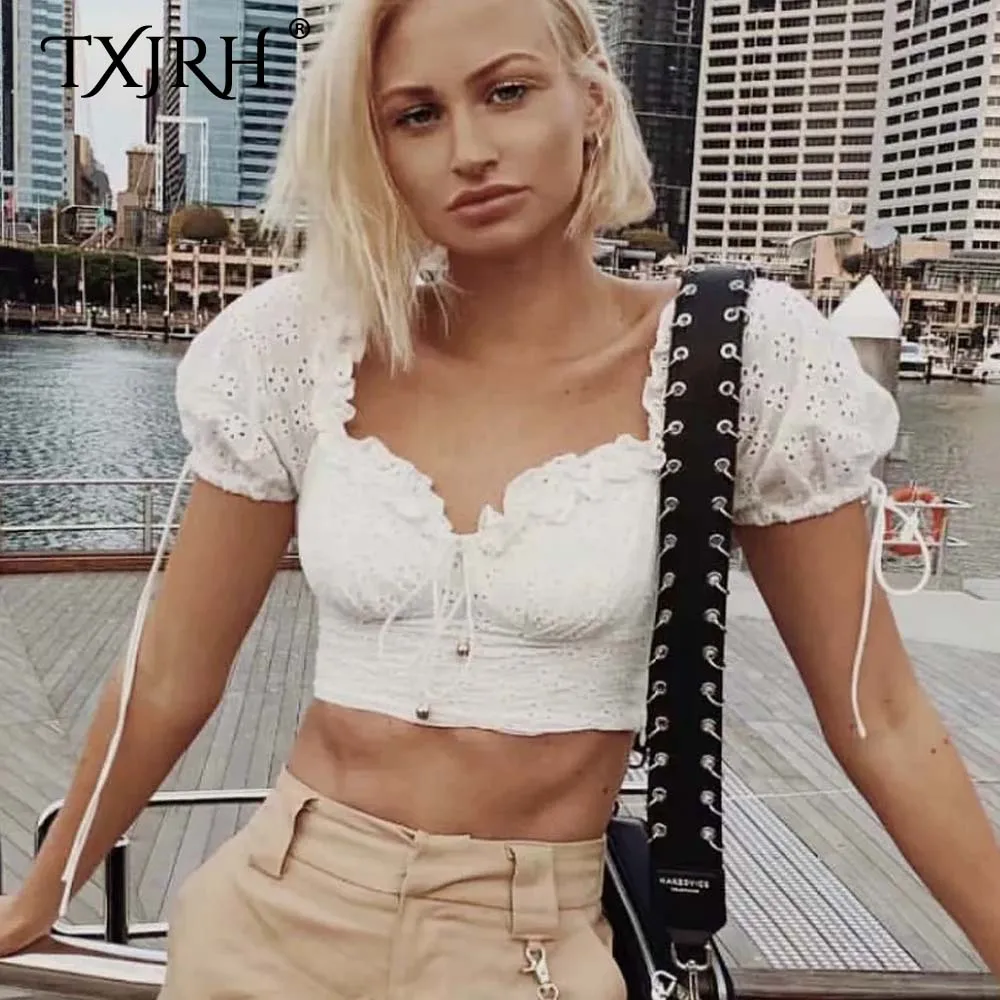 Best TXJRH Sweet Girdle Type Waist V-Neck Wood Ears Bow Hollow Out Floral Shirt Short Puff Sleeve Slim Blouse Exposed Navel Crop Tops Free Shipping