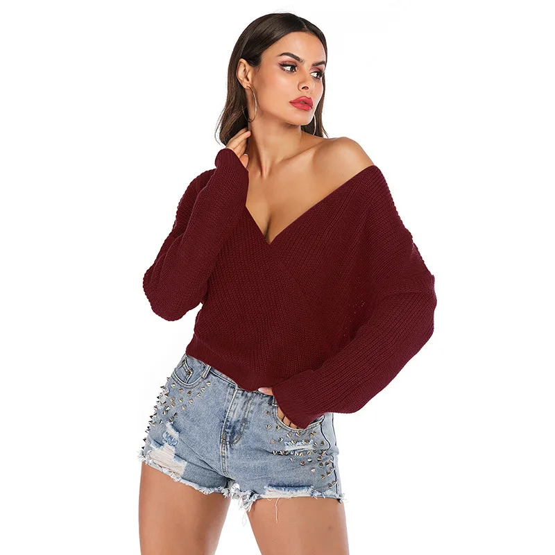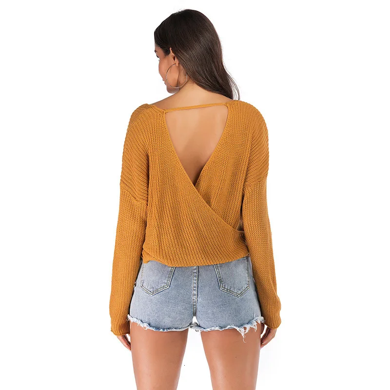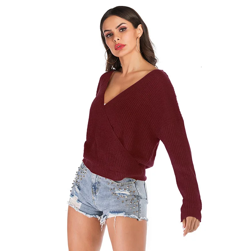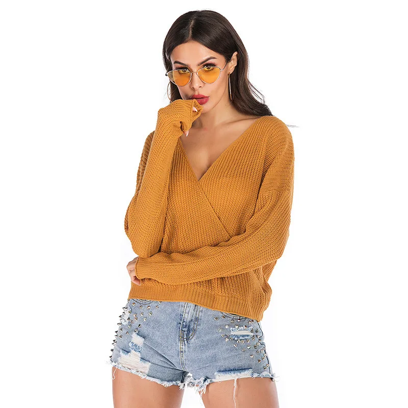 Cheap Autumn Women Casual Double V-neck Sexy Pullover Plain Color Full Sleeve Knitted Sweater New Fashion Pull Femme Nouveaute 2020 Free Shipping