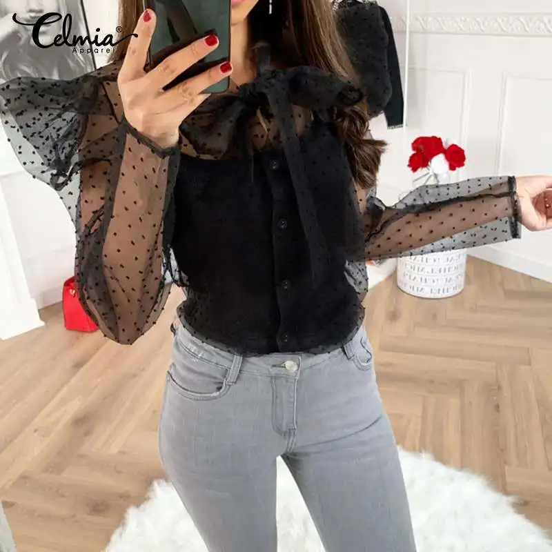 If You search information for Blouses , then Celmia Sexy Women Mesh Sheer See-Through Long Sleeve Ruffles Tops Fashion Blouses 2020 Summer Bow Neck Loose Casual Shirts 5XL may be make you like