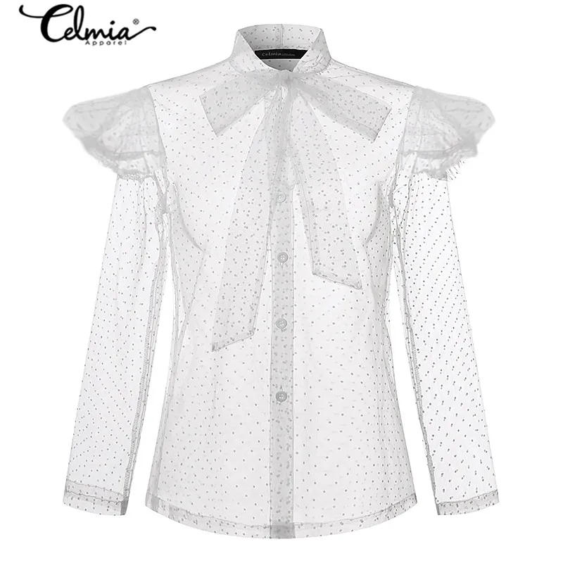 .Gallery of Celmia Sexy Women Mesh Sheer See-Through Long Sleeve Ruffles Tops Fashion Blouses 2020 Summer Bow Neck Loose Casual Shirts 5XL