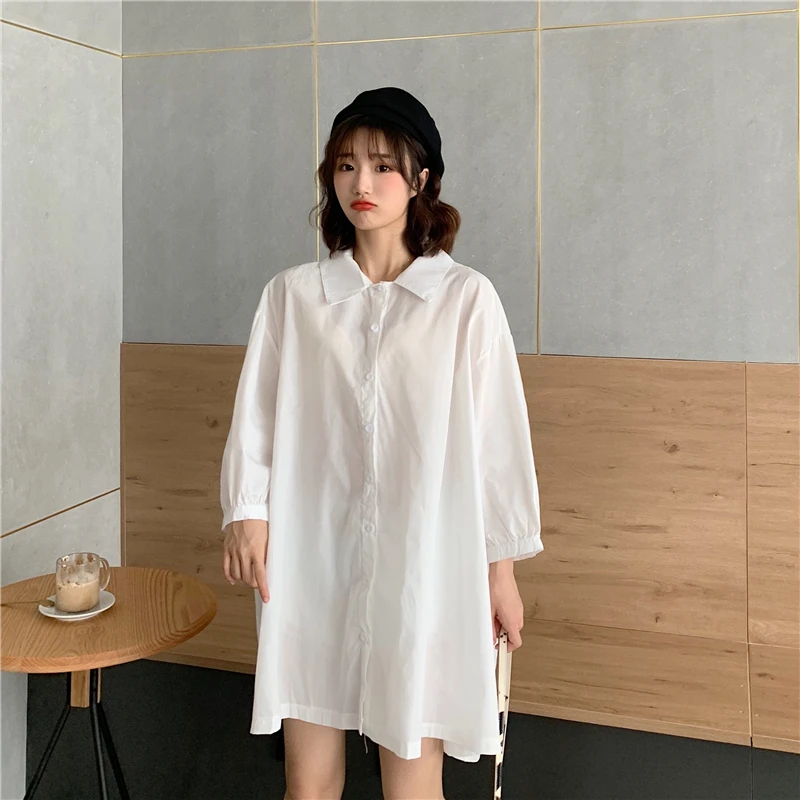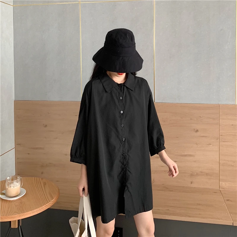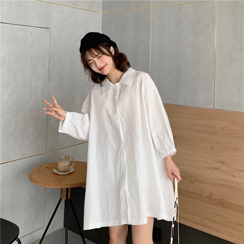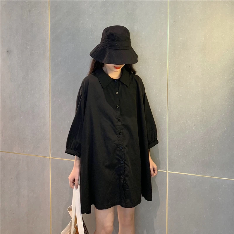 .Pictures for Fashion Woman Casual White Black Oversized Shirt Three Quarter Batwing Sleeve Turn Down Collar Drop Shoulder Loose Cotton Shirts