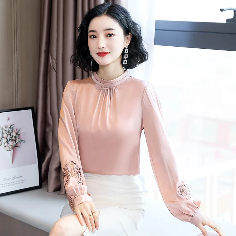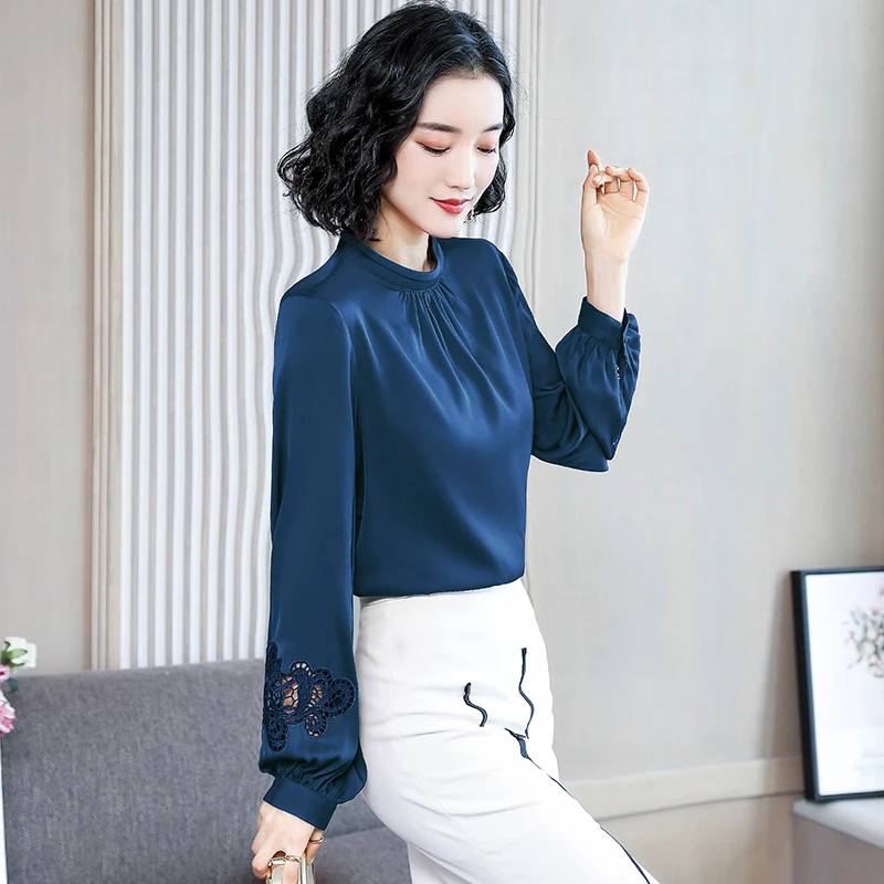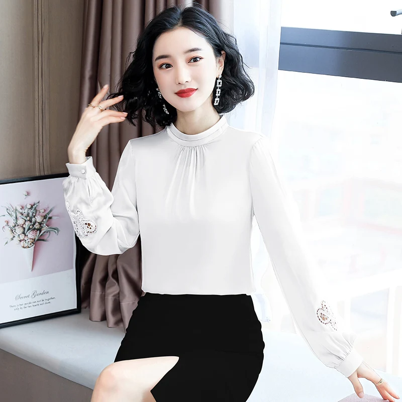 Offer Description for Korean Fashion Silk Women Blouses Elegant Women Satin Blouse Shirts Lady Lantern Sleeve Hollow Out Blouses Shirt Plus Size Tops