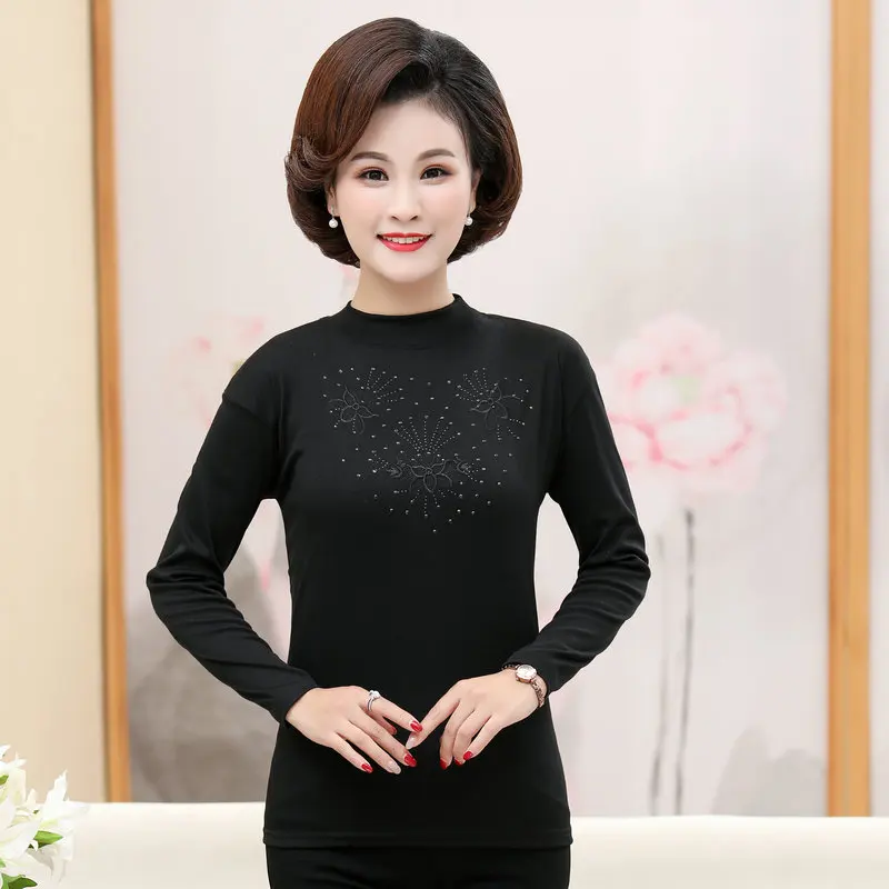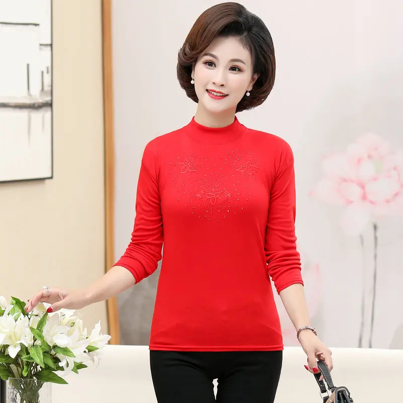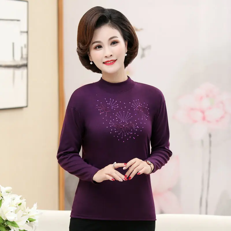 If You will buy for Women's Tops, then Middle Aged Women Casual Blouses Red Purple Black Blue Flower Sequined Design Slim Fit Top Woman Leisure Basic Crew Neck Blouse is possible make you love