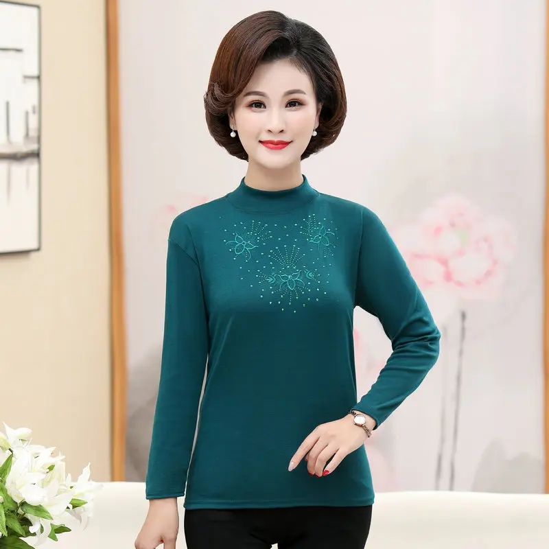 .Pictures of Middle Aged Women Casual Blouses Red Purple Black Blue Flower Sequined Design Slim Fit Top Woman Leisure Basic Crew Neck Blouse