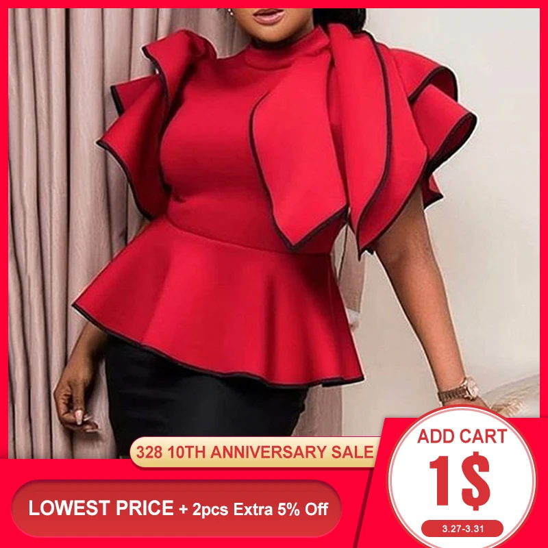 Cheap Red Falbaba Women Blouse Tops Summer African Ruffles Sleeve High Waist Female Shirts Elegant Office Lady Work Tops 2020 Blouses Free Shipping