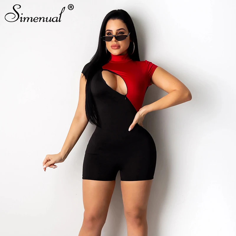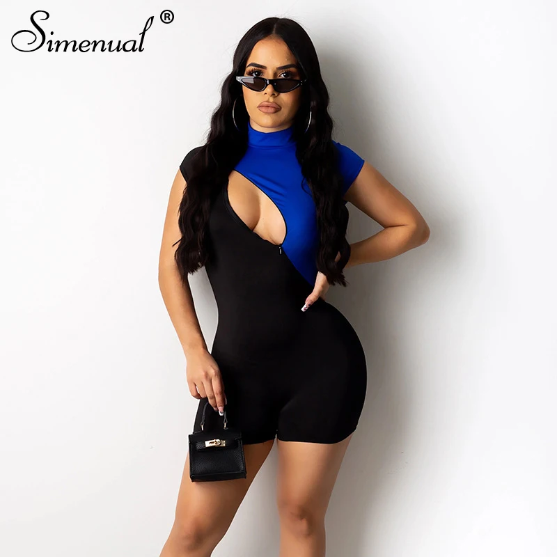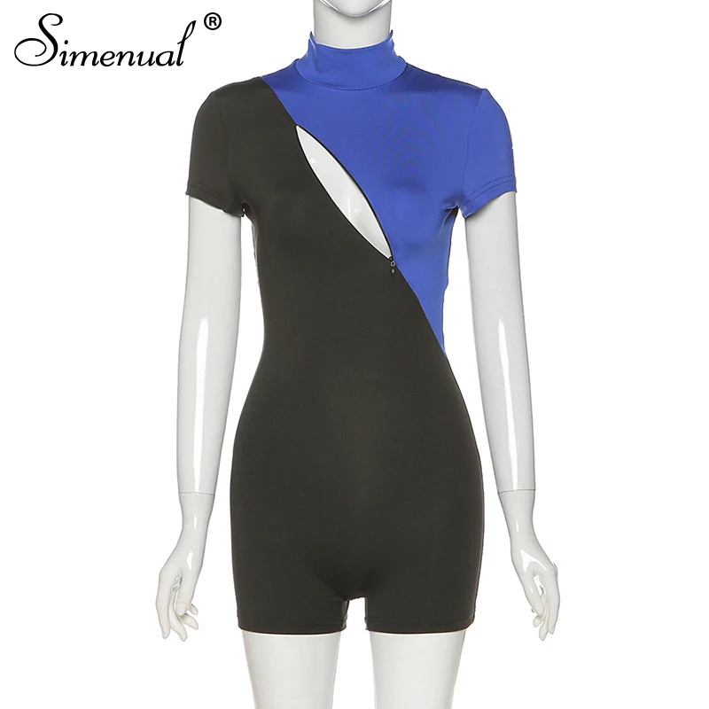 .Gallery for Simenual Zipper Color Blocking Workout Rompers Women Sporty Active Wear Short Sleeve Playsuits Casual Patchwork Fitness Playsuit