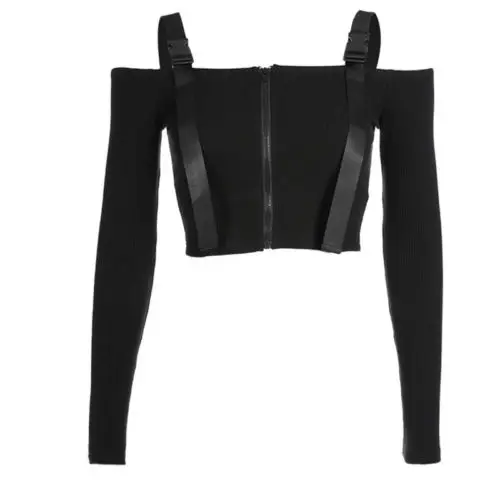 .Images for Women Autumn Slim Off Shoulder Long Sleeve Knitted Crop Tops Ladies Sexy Solid Zip Up Sweater Plus Size