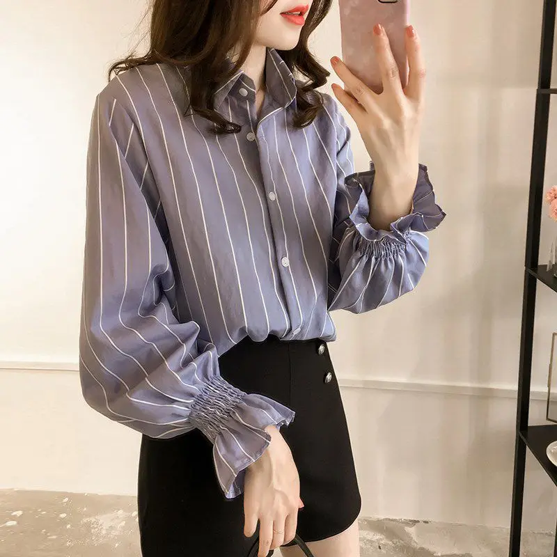 Price Description of 2019 Trumpet Sleeve Loose Shirt Women Striped Print Blouse College Pocket Lapel Blouse