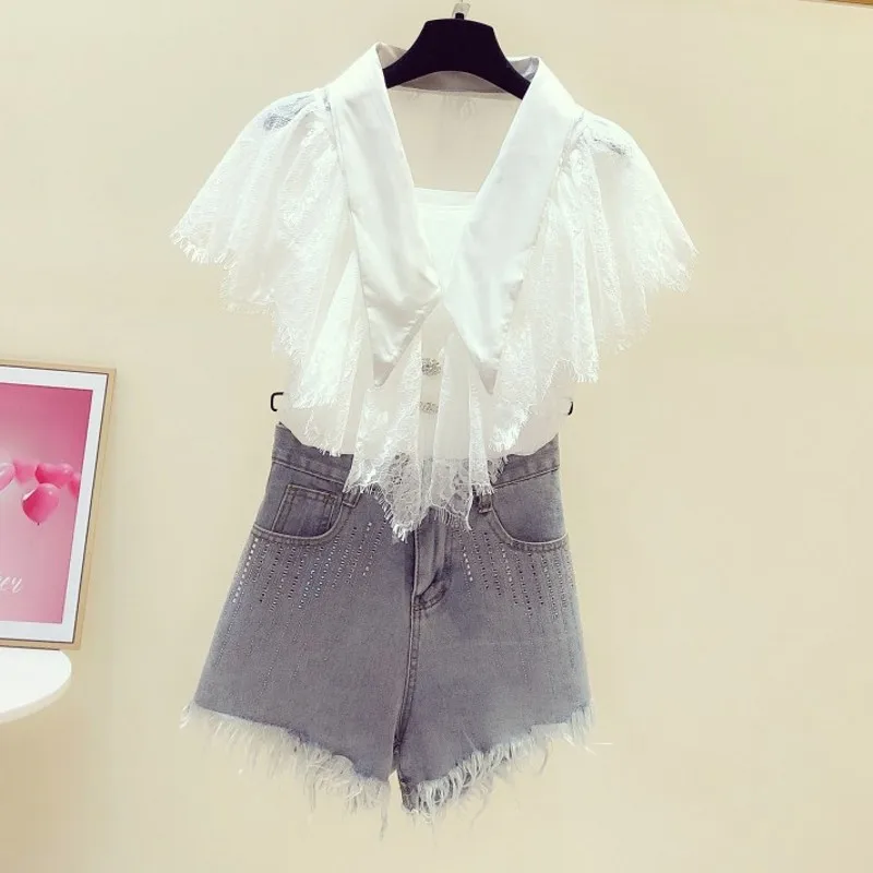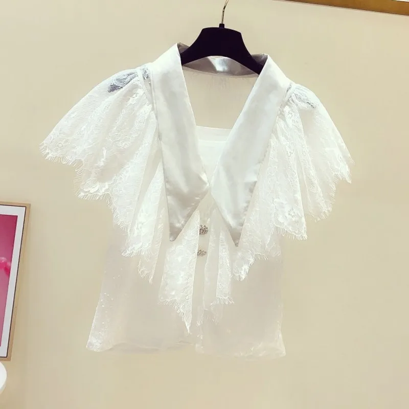 .Pictures for Blouse Women 2020 Summer Wear New Fold-down Collar Ddiamante Buckle Lace Flounced Shirt Women's Elegant White Lace Blouses Blusa