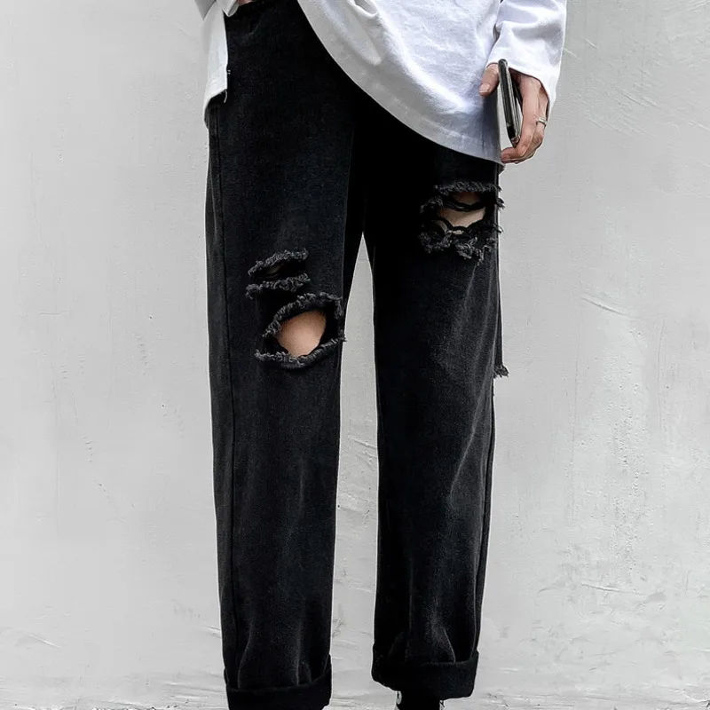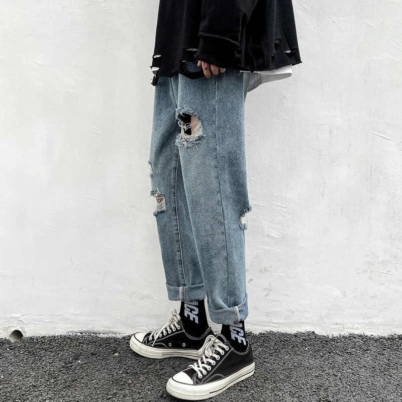 Offer Description for Blue Black Ripped Jeans Men's Fashion Washed Retro Casual Straight Jeans Pants Men Streetwear Loose Hip Hop Hole Denim Trousers