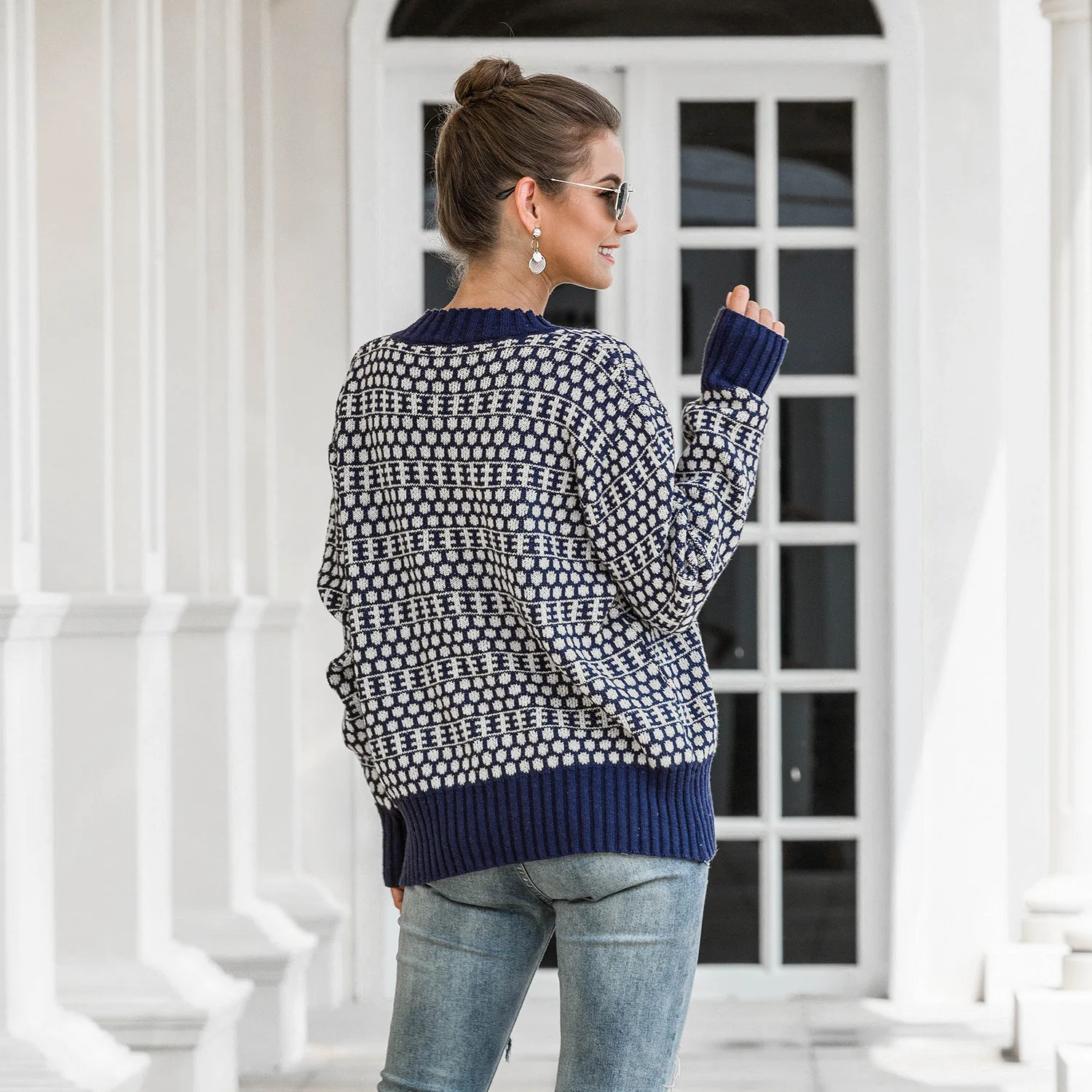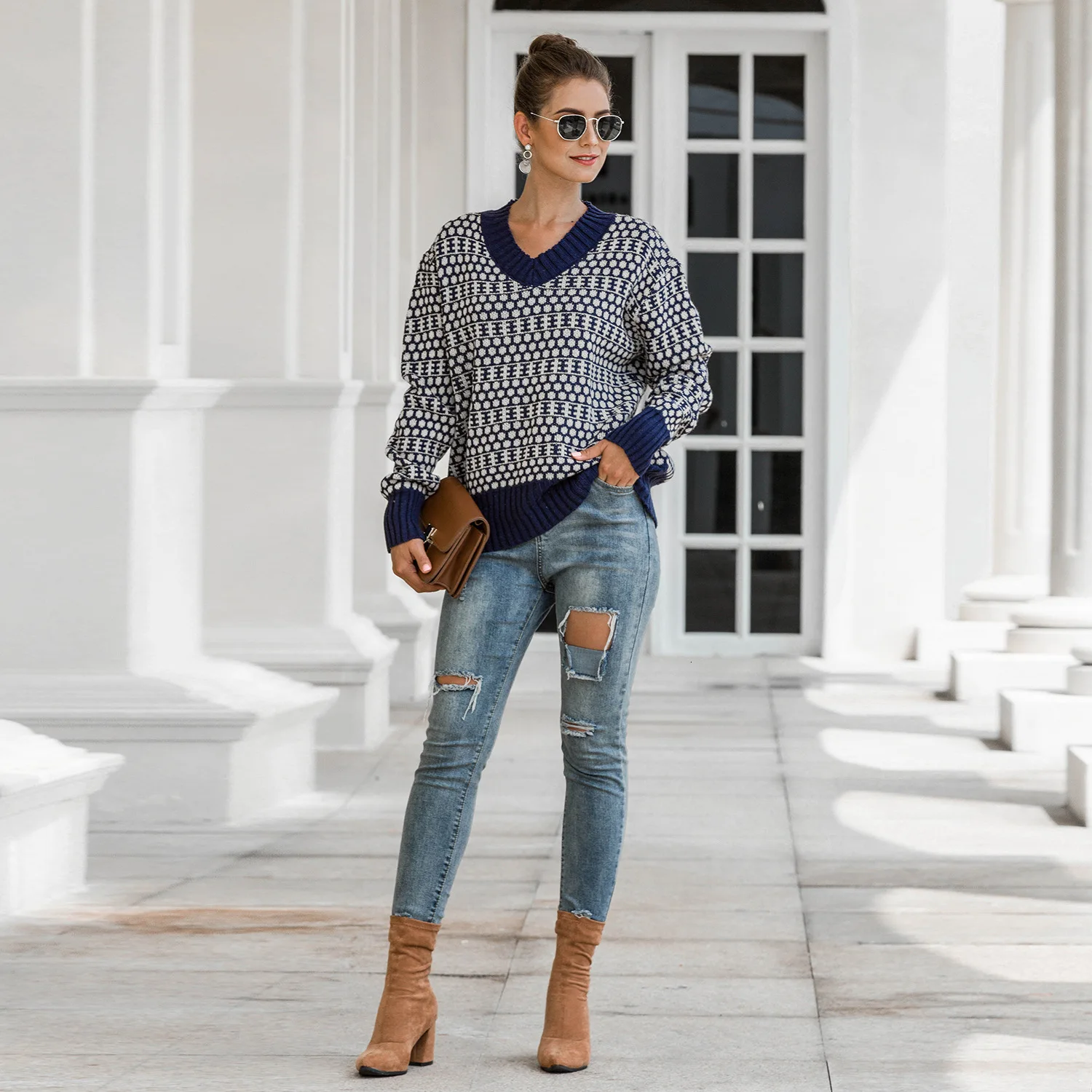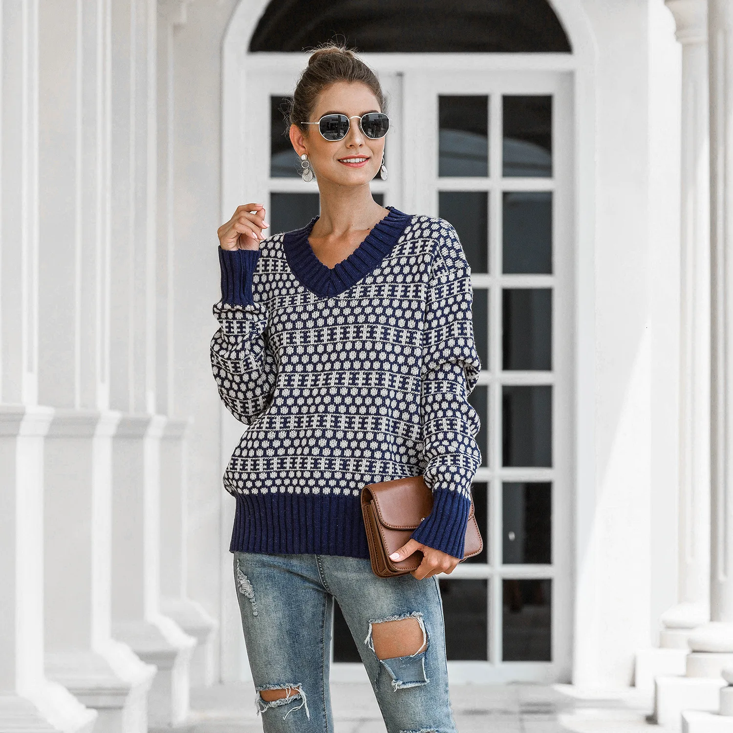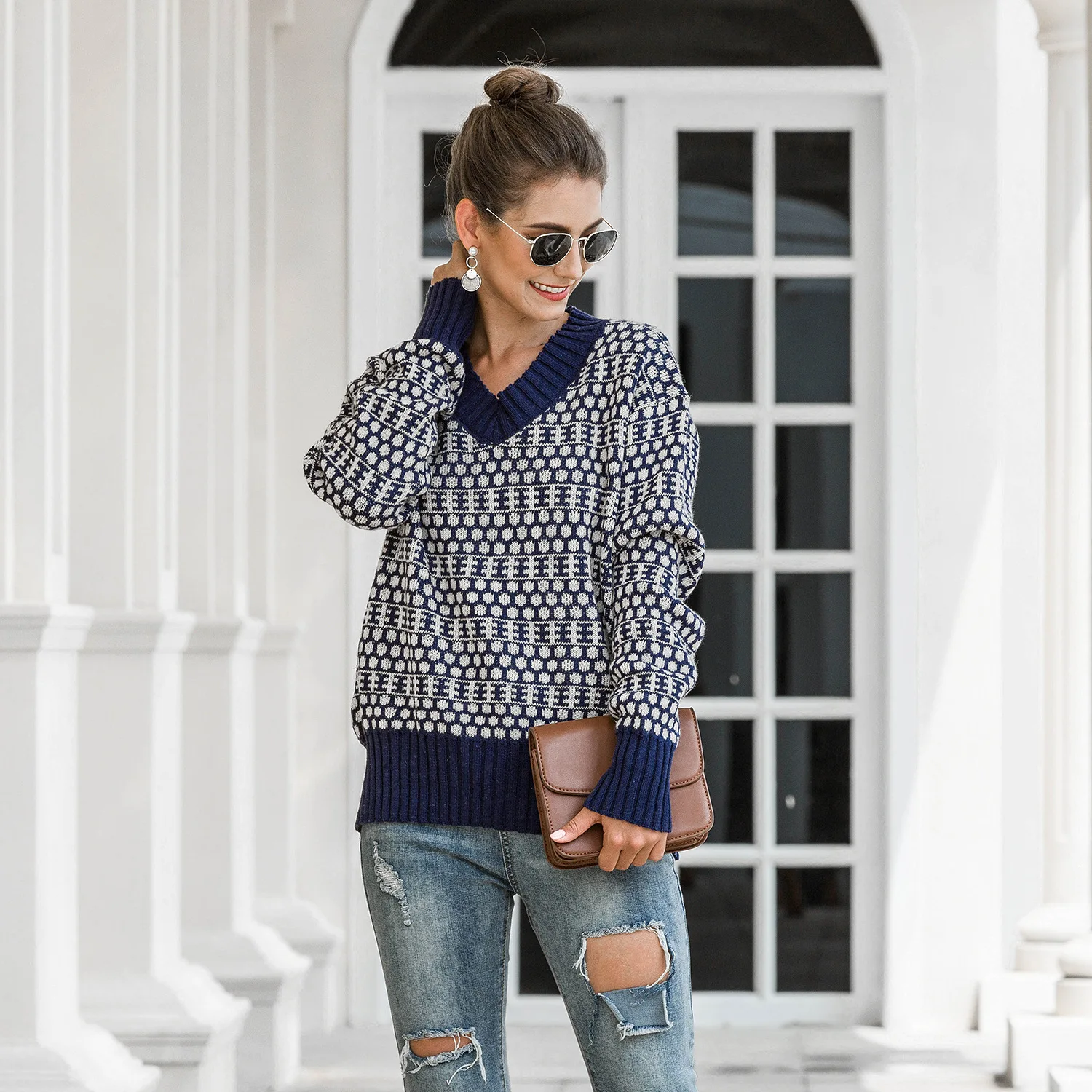 Best Fashion Geometric Printed Women Sweater V Neck Casual Autumn Winter Sweater Female Jumper Knitted Pullover 2020 Pull Hiver Femme Free Shipping