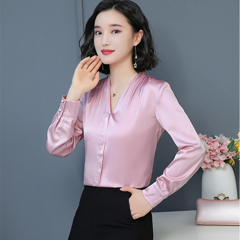 .Pictures for Korean Fashion Silk Women Blouses Solid Long Sleeve Pink Women Shirts Plus Size XXXL/4XL Blusas Femininas Elegante Ladies Tops