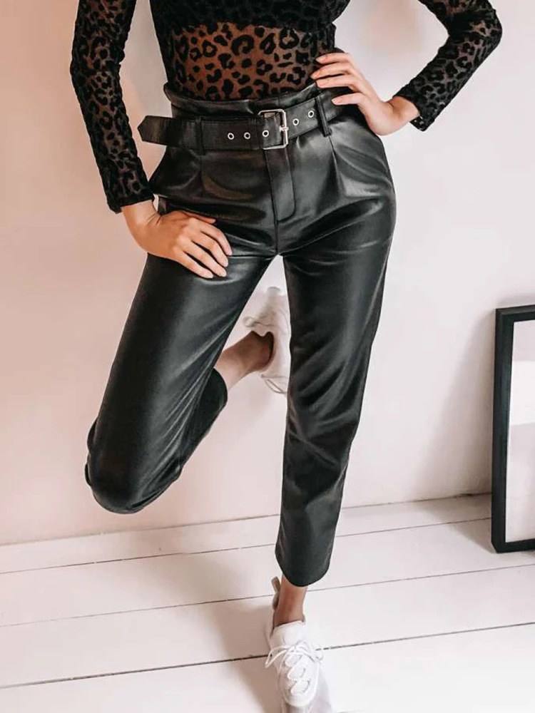 Limited Chance for Linglewei New spring and Autumn Women's Trousers belt Straight leather pants Street tide trousers