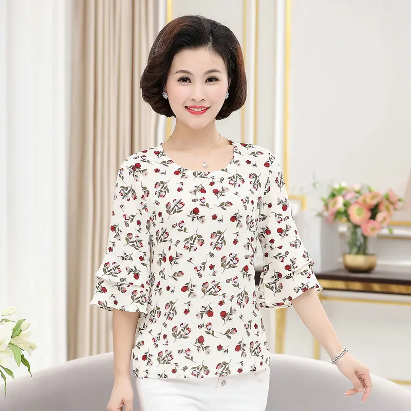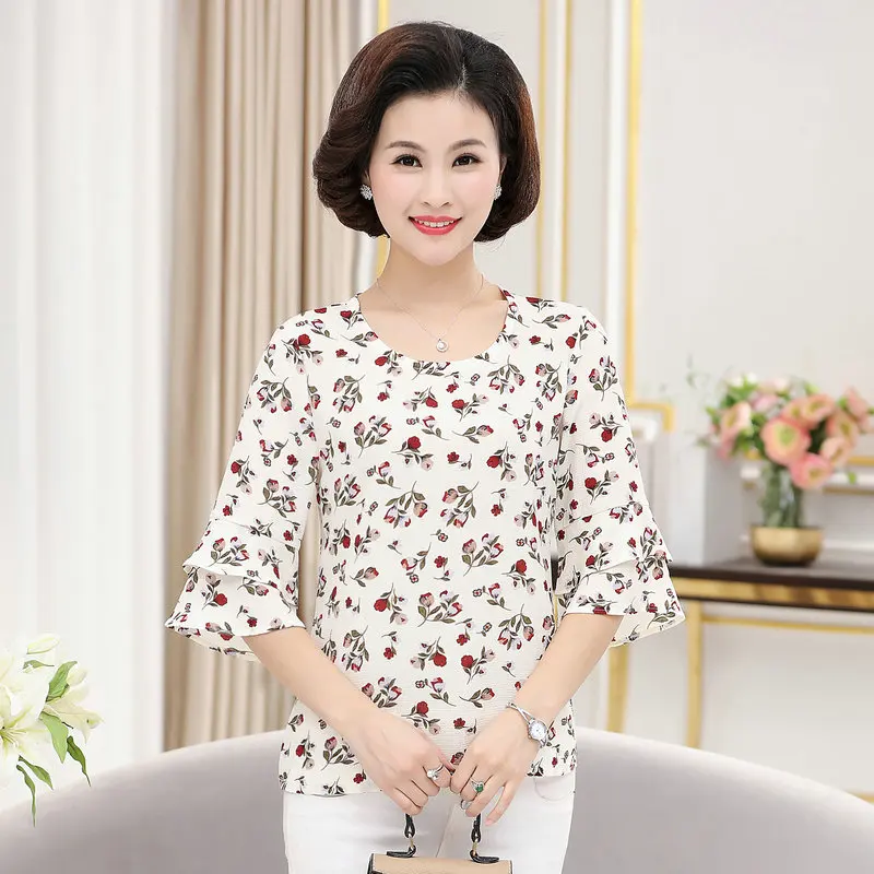 Buy Middle Aged Women Summer Chiffon Blouses Red White Black Short Sleeve V-neck Crepe Tops Female Casual Floral Blouse Plus Size up to 2098-12-31, and You will Save US $17.1 or 45%, Becuase You Just Pay for 21.45 not Full Price for 39.00