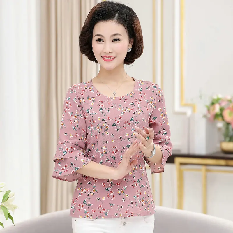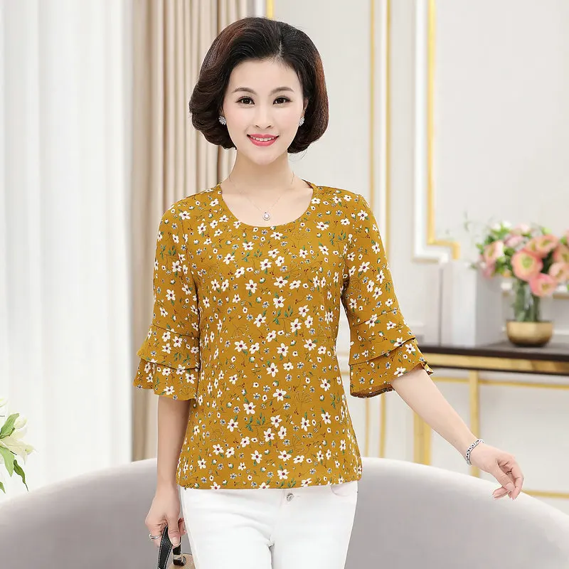 If You will buy for Women's Tops, then Pink Yellow Blue White Small Pieces Flower Chiffon Blouses Half Length Layered Sleeve EO-neck Romantic Crepe Tops Female Clothes may be make you like