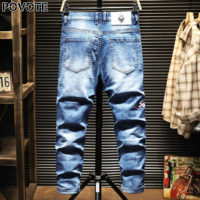 Special Chance of POVOTE jeans men's hip hop trend pants slim pencil pants men's jeans pants locomotive jeans pattern trend design OSK