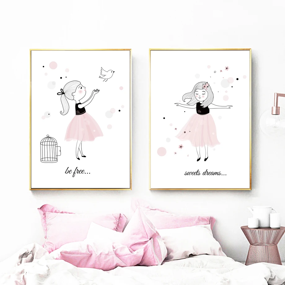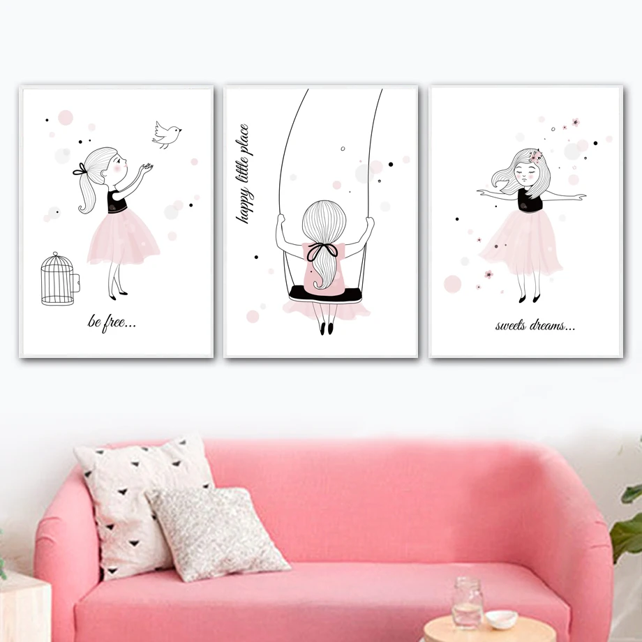 Best Swinging Girl Dancing Pink Skirt Bird Wall Art Canvas Painting Nordic Posters And Prints Wall Pictures Baby Kids Room Home Decor Free Shipping