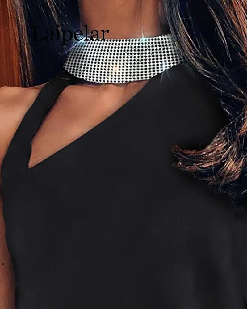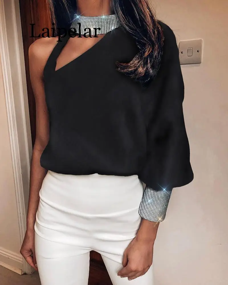 .Gallery of 2020 Spring Fashion Elegant Women Long Sleeved Top Blouse Lantern Sleeve Solid Patchwork Diamante Trim One Shoulder Blouse