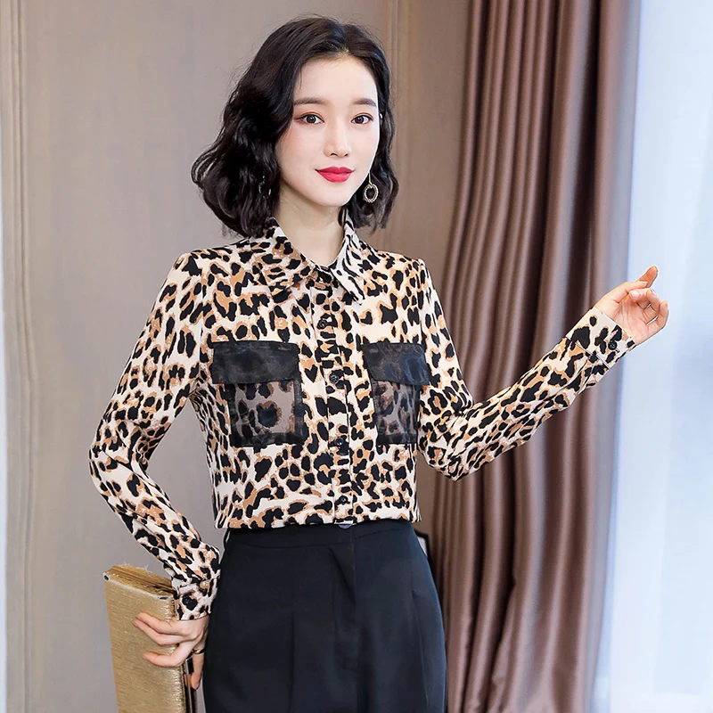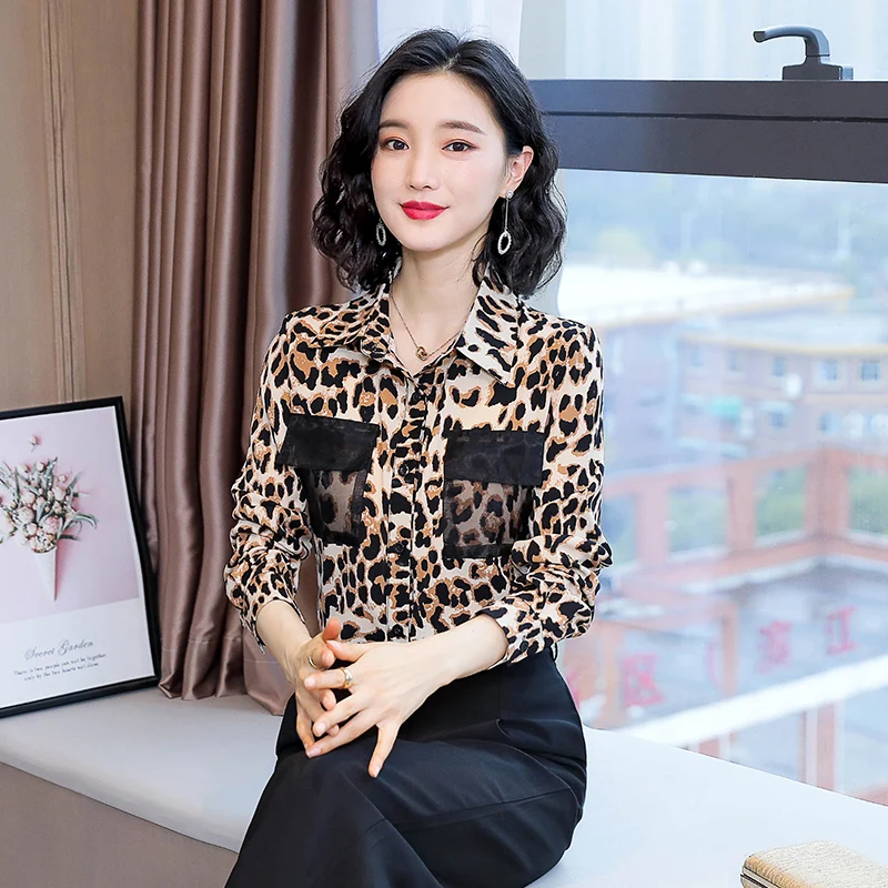 .Pictures of Fashion Silk Women Shirts Woman Leopard Blouse Elegant Women Print Blouses Shirt Plus Size Woman Satin Blouses Long Sleeve Shirt