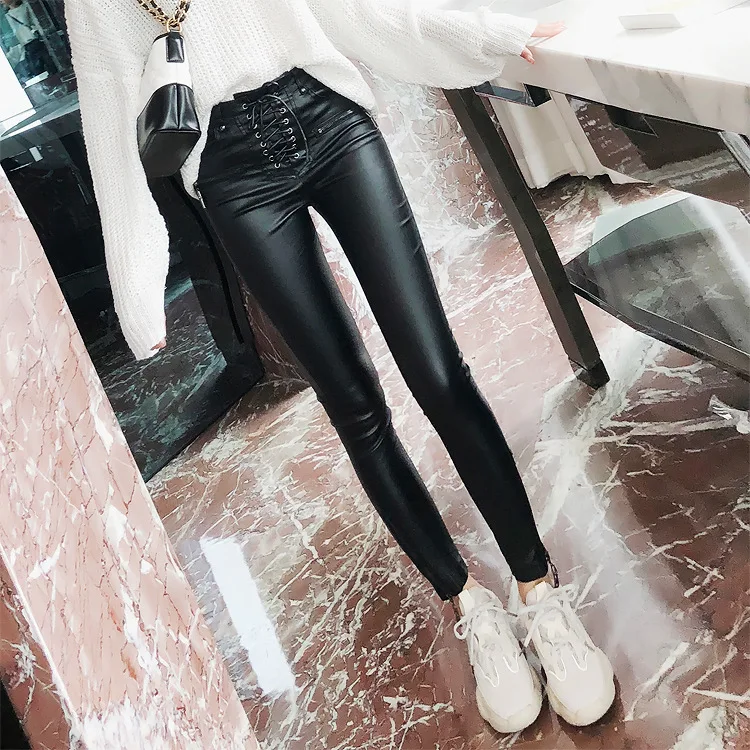 .Pictures of HOUZHOU Pu High Waist Pants Women Leather Trousers Women Lace-up Streetwear Skinny Pencil Pants Ankle Length Pants for Women
