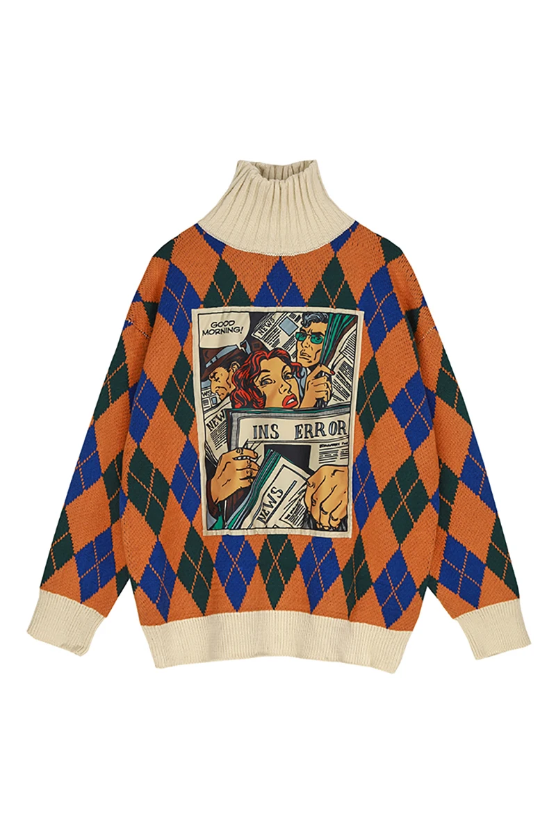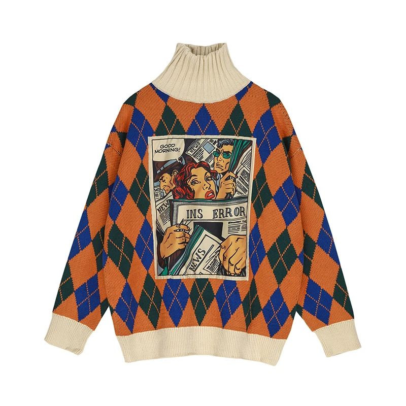 Offer Description of iMucci Korean Fashion Tops Woman Loose 2020 Cartoon Printing Split Joint Knitting Woman Long Sleeve Turtleneck Sweater TM1184